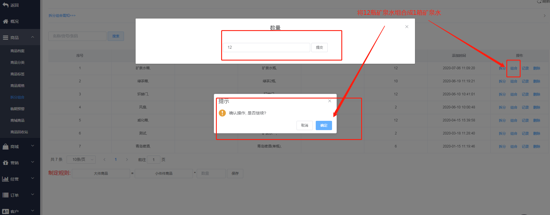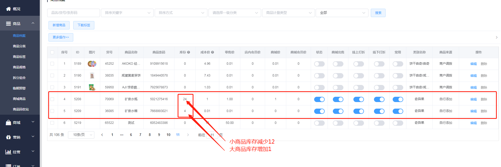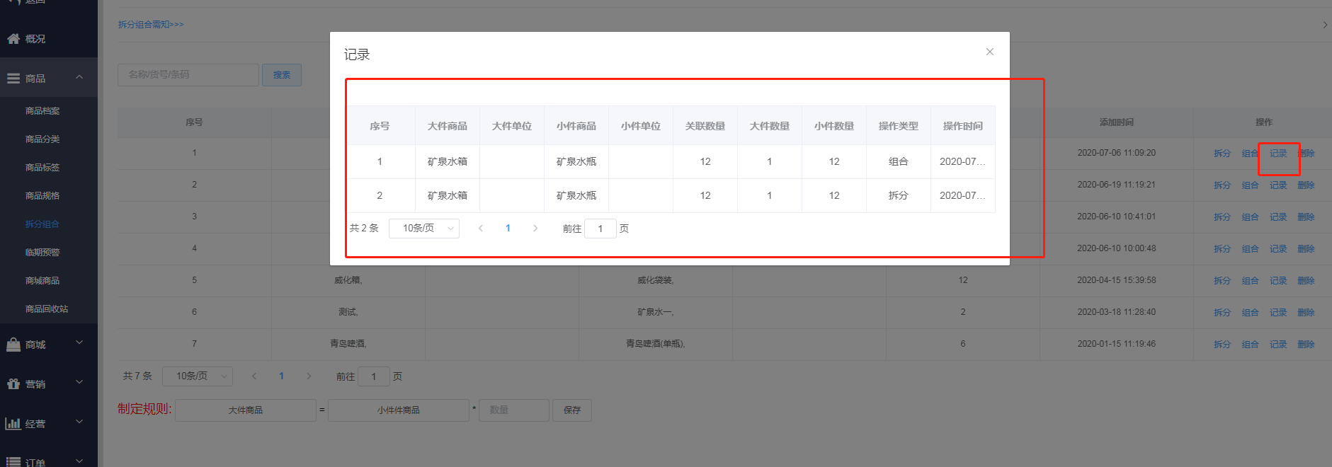 2\. 拆分操作是将大件商品拆成小件商品,拆分数量指的是要拆的大件商品的数量,操作成功后大件商品库存减少,小件商品的库存根据规则增加相应的关联数量