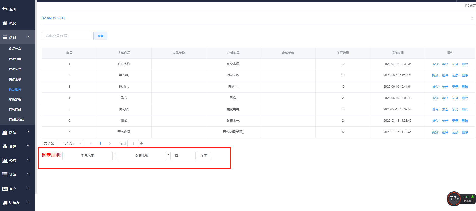 3\. 组合操作是将小件商品组合成大件商品,组合数量是指小件商品的数量,操作成功后小件商品库存减少,大件商品的库存根据规则增加相应的数量(小件商品的组合数量/关联数量 = 大件商品增加的数量)