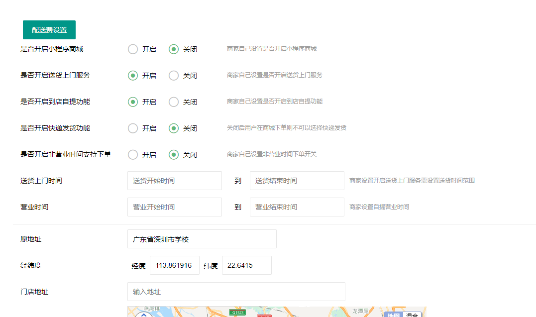 设置门店开启小程序展示,配送费和配送方式,可以修改门店地址