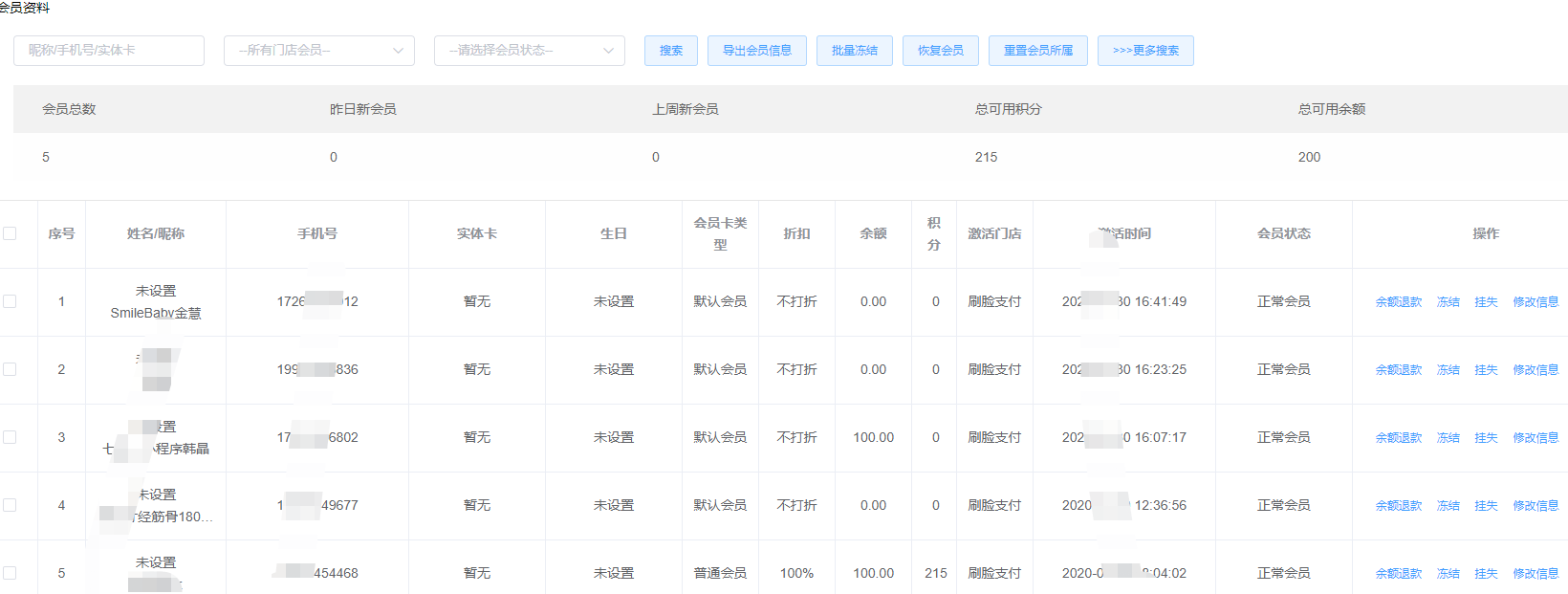 1、商户可在常规会员页面修改会员信息和密码,会员挂失、余额退款和冻结会员