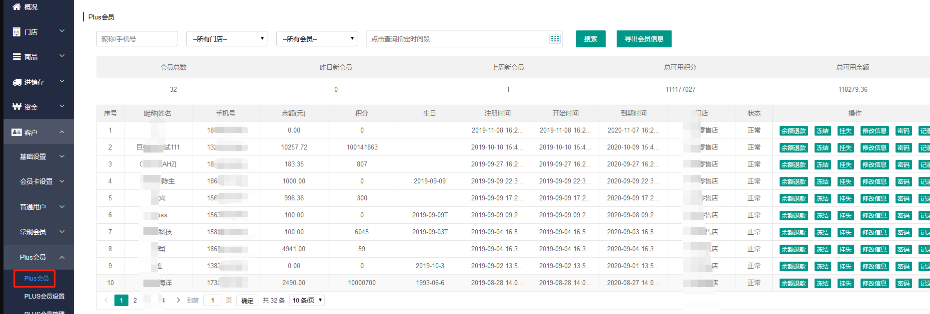 1、商户在此页面修改plus会员信息,余额退款、挂失和修改会员密码