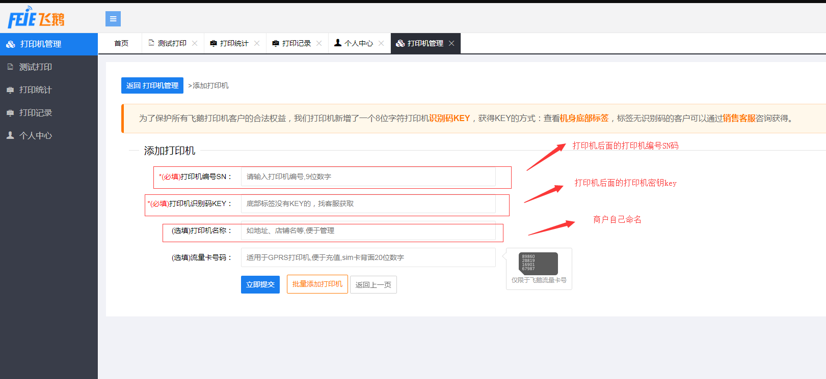4、进入官网添加打印机,注册后登陆账号,点击打印机管理——添加打印机——填写要添加的打印机信息(SN码,识别码key都在打印机的底部)