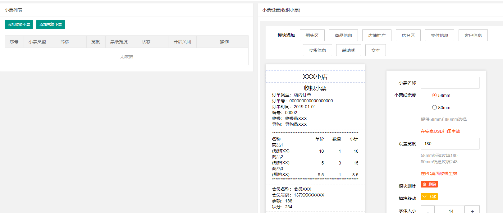 2、点击添加收银小票,选中想要设置的位置,例如选中小票名称部分,在右侧设置小票名称、纸的宽度、是否删除该模块、模块上下移动字体大小等信息都可设置,(注:如果想要设置小票上面的二维码,将按填写的内容生成二维码,建议填写网址链接)