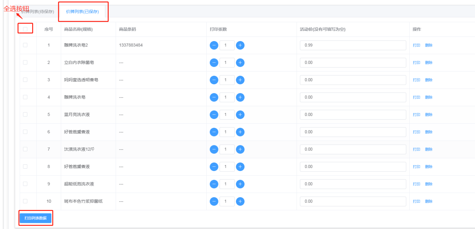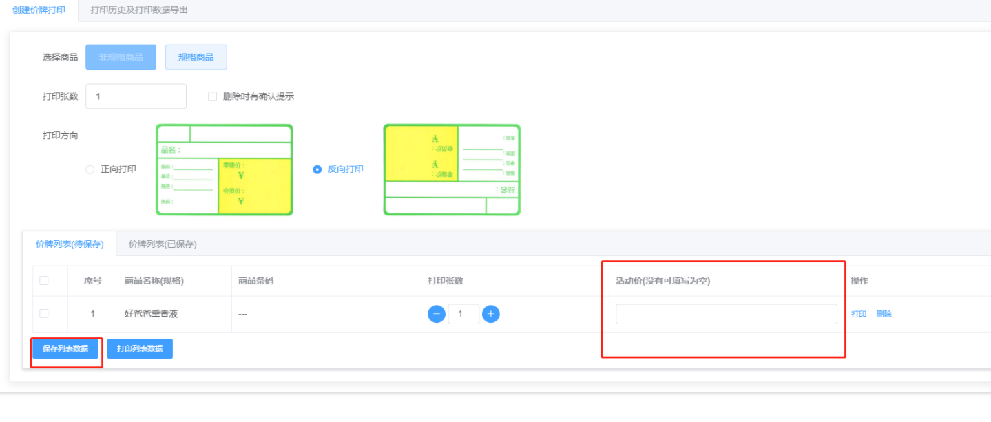 6、进入后台选择想要打印的商品,输入活动价,点击保存列表数据