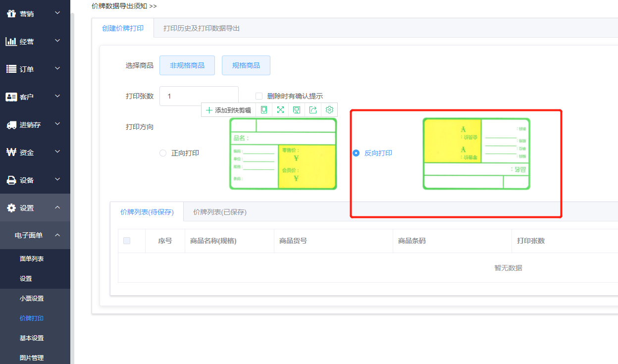 3、登录进入门店后台,点击价牌打印——选择反向打印