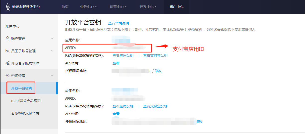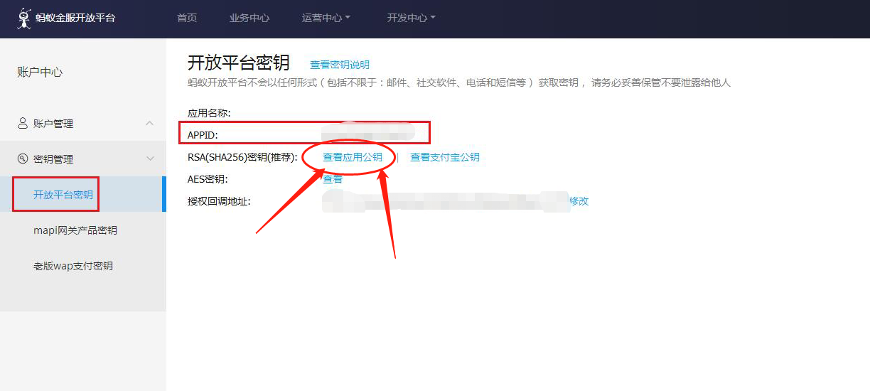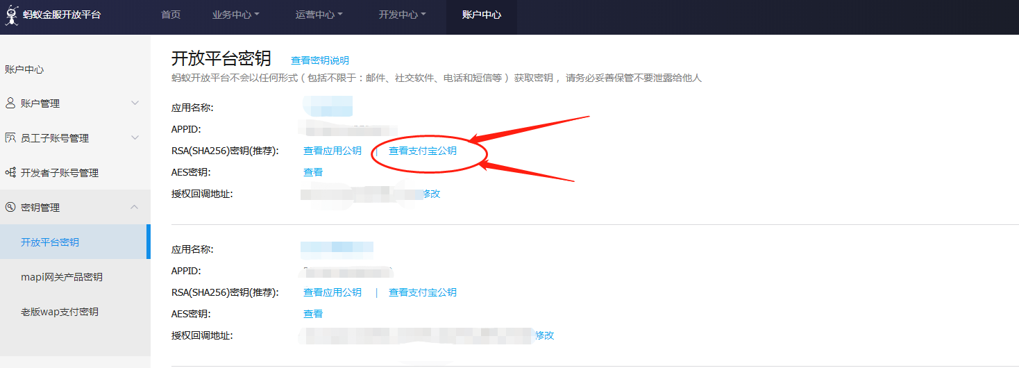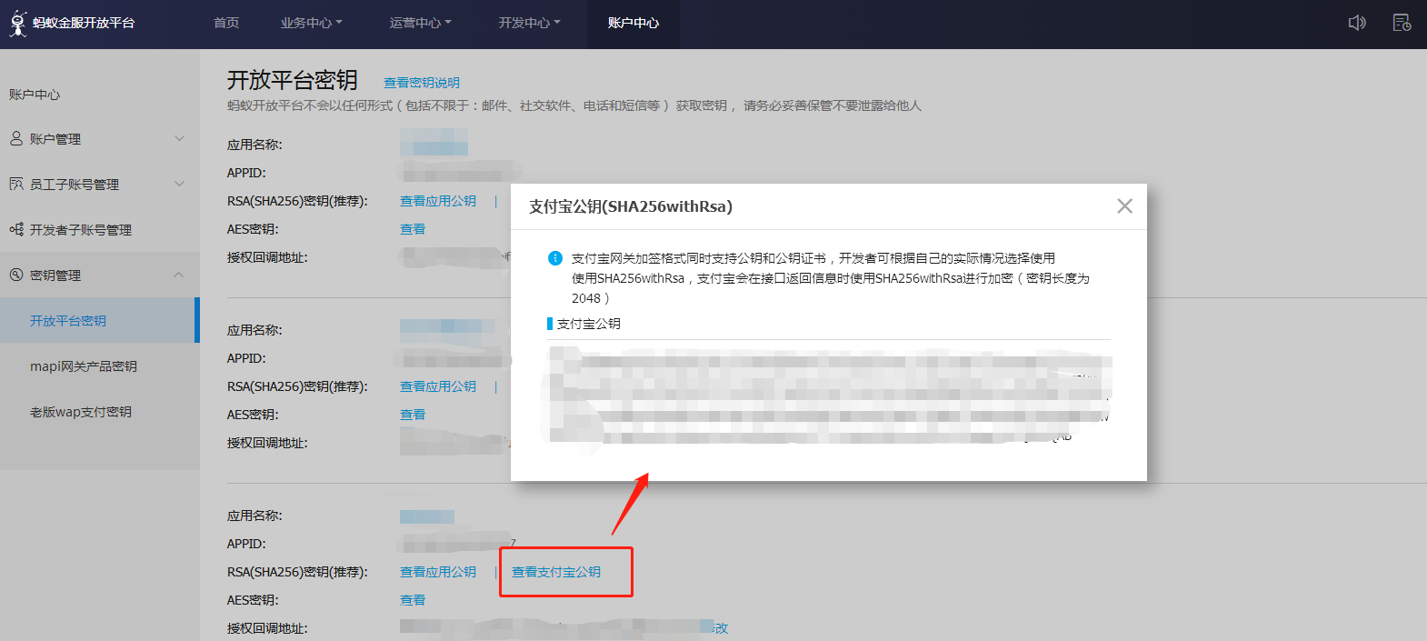 7、点击查看支付宝公钥 ,复制粘贴至商户后台支付宝公钥