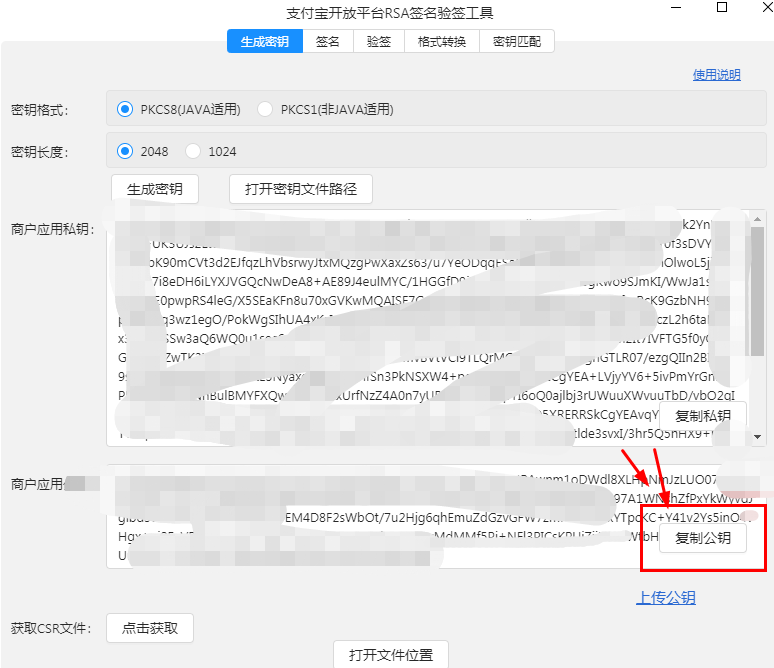 6、点击复制公钥至支付宝后台 查看应用公钥