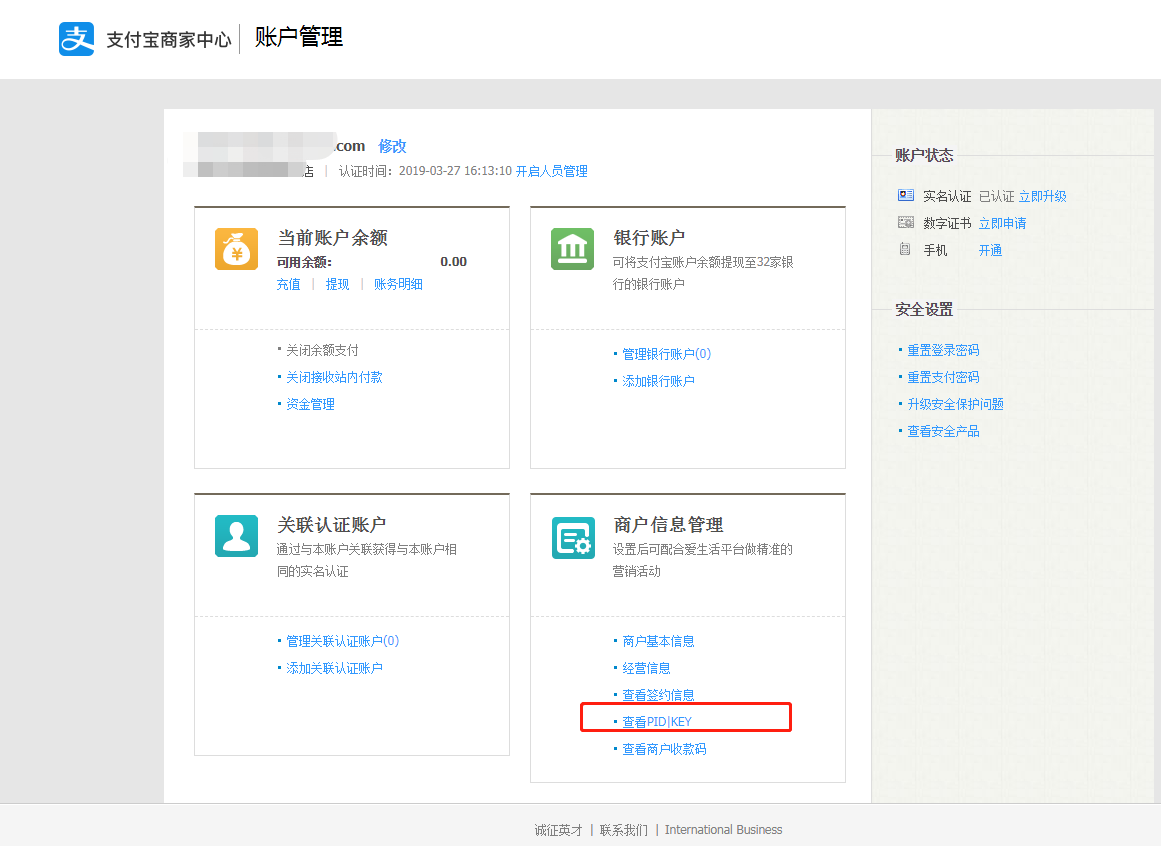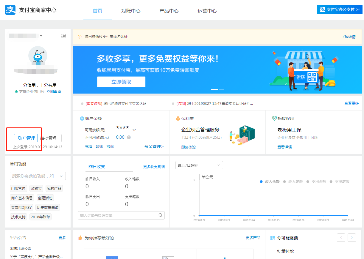 1、在浏览器中登入自己的支付宝后台,点击 首页——账户管理