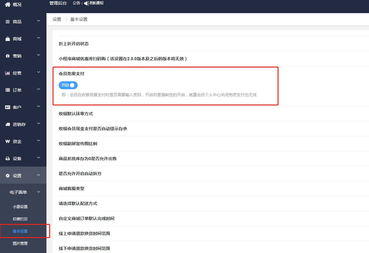 即:会员在收银场景支付时是否需要输入密码,开启则是强制性的开启,就算会员个人中心关闭免密支付也无效