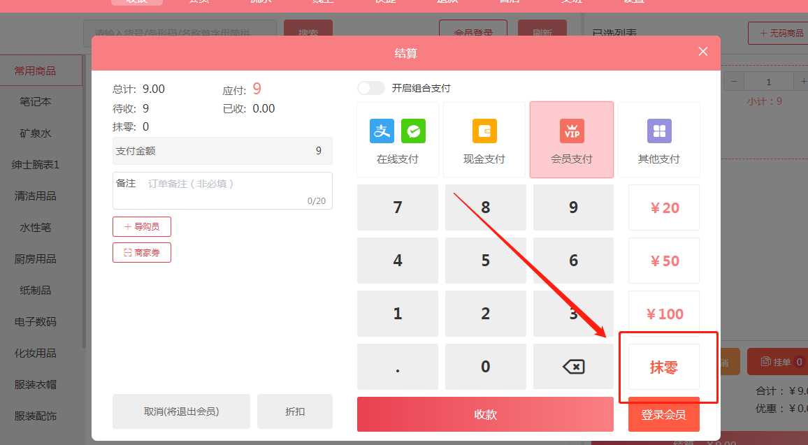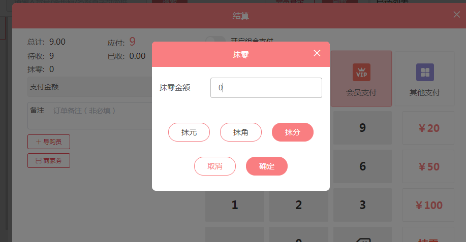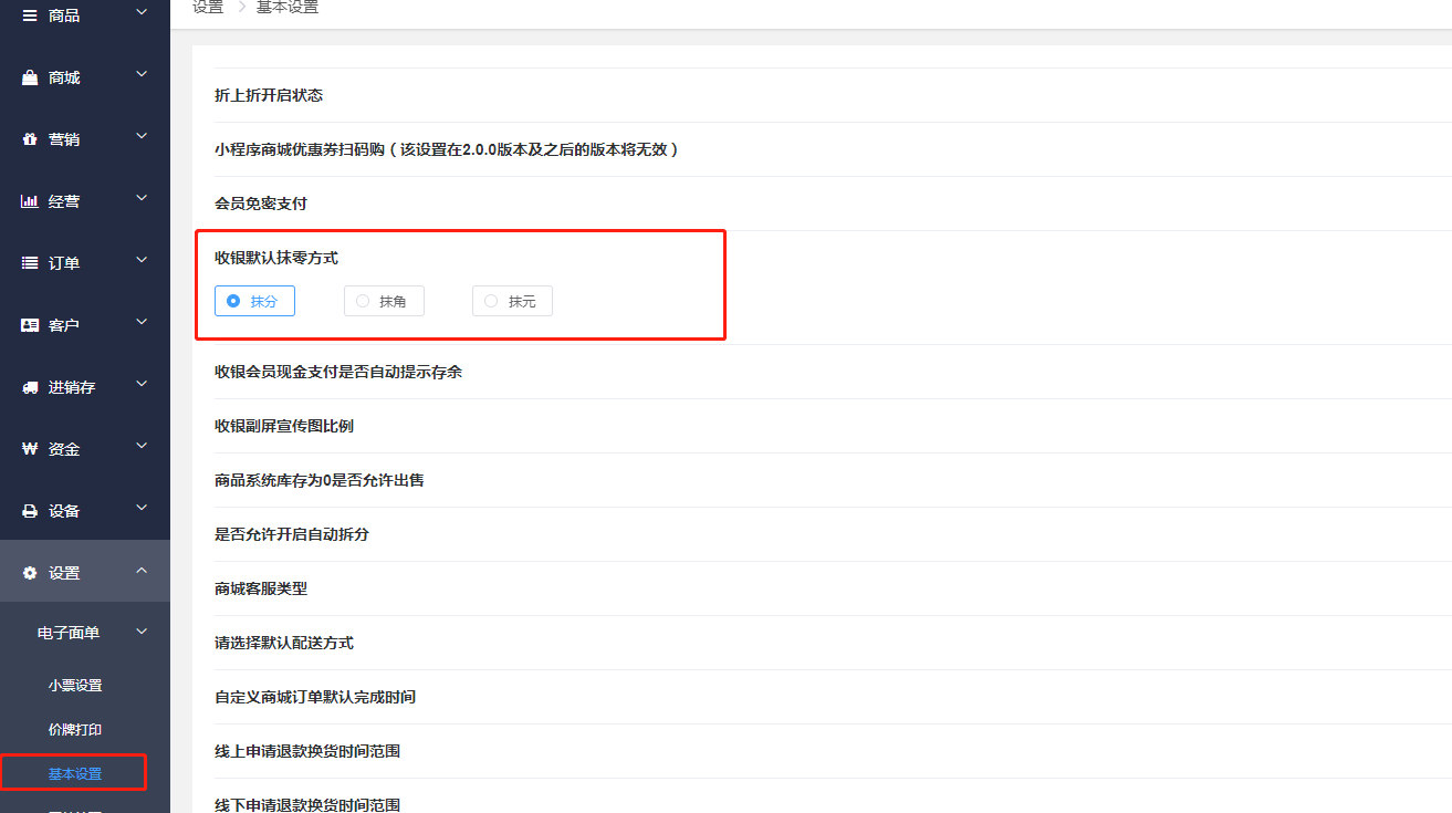 店长后台设置完默认的抹零方式后,收银员抹零时默认后台的设置