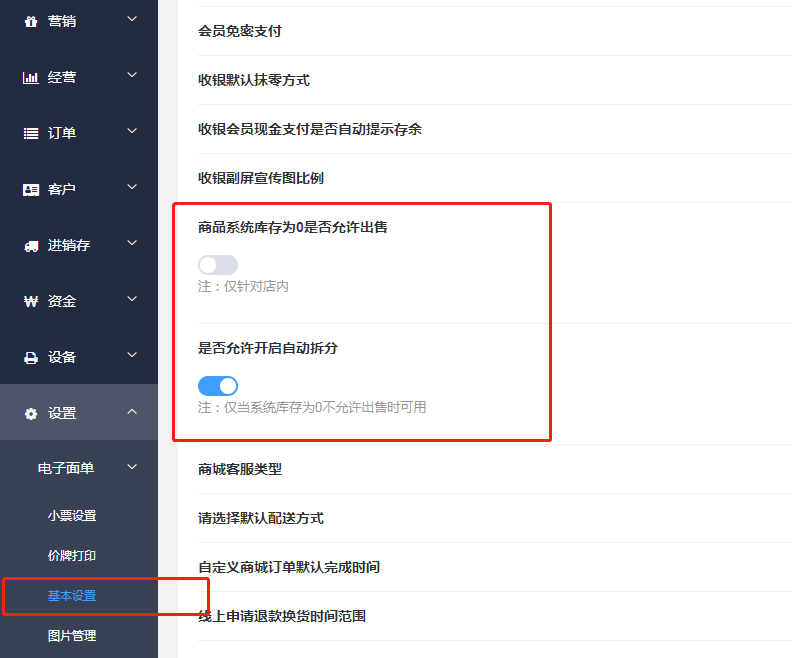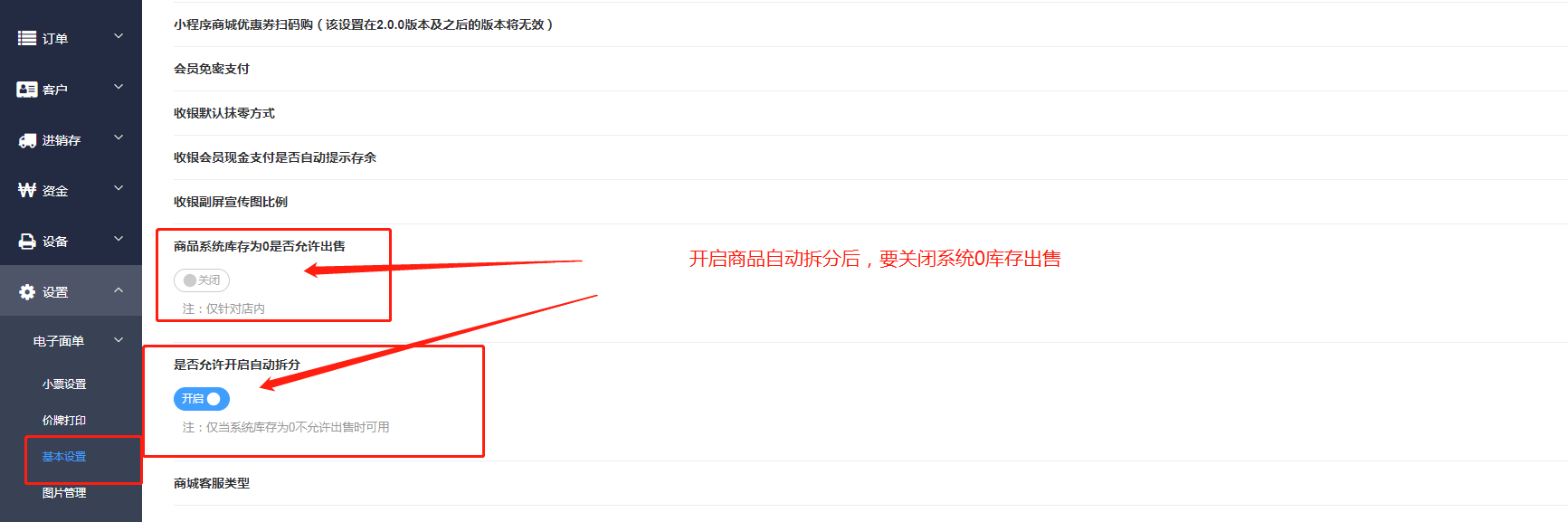 开启自动拆分按钮后,线下零库存销售按钮需要关闭,否则无效