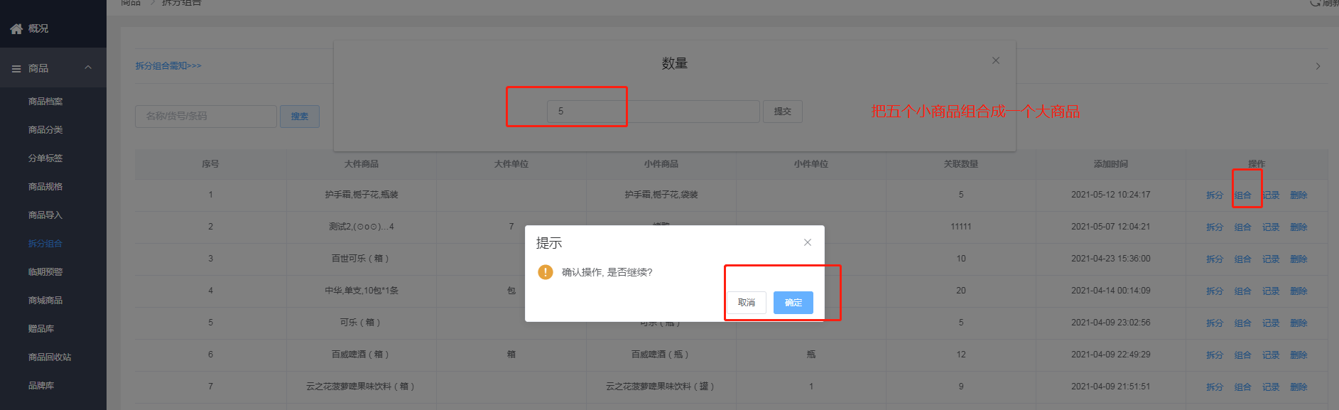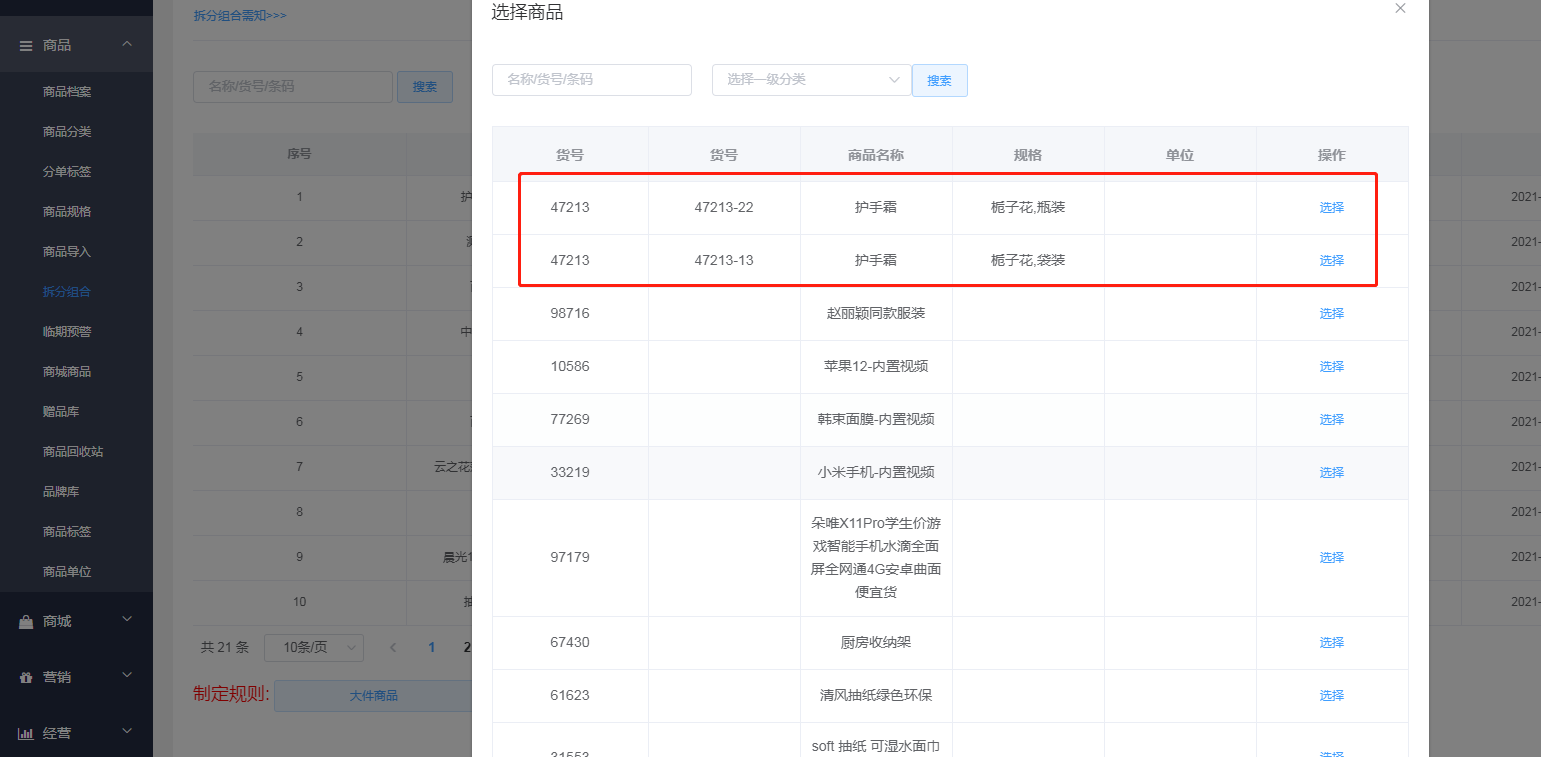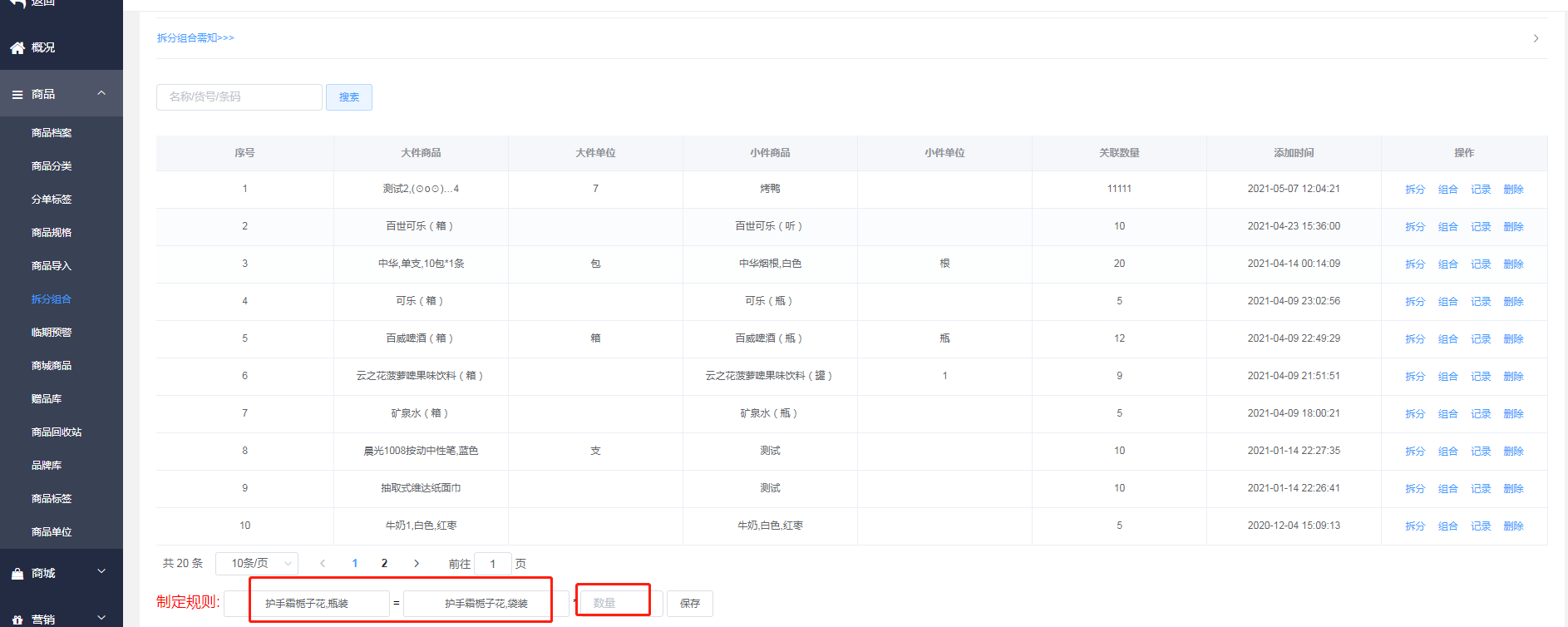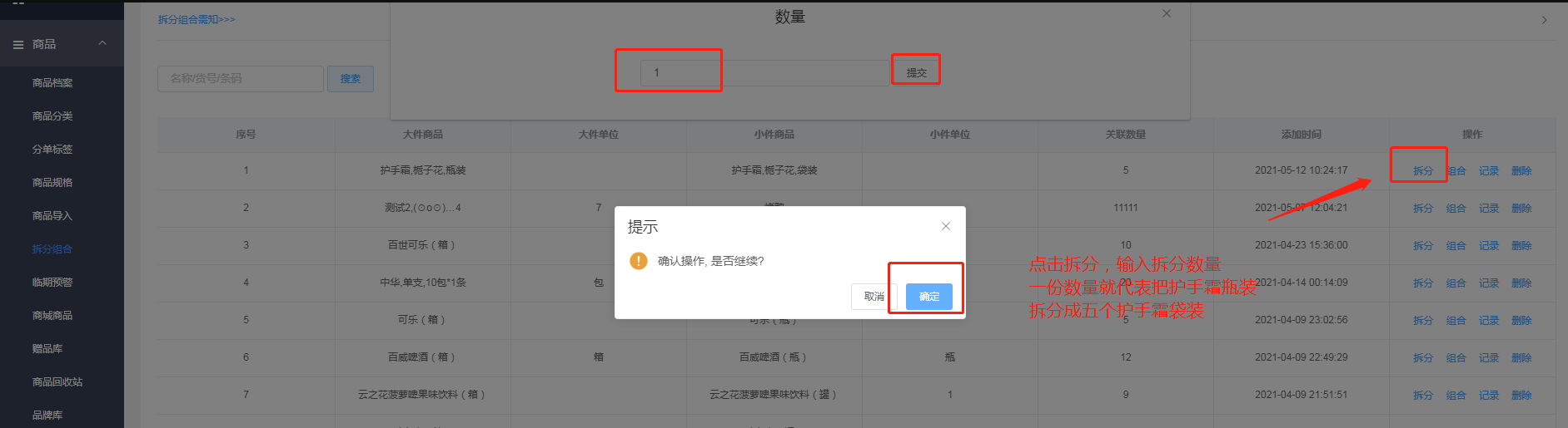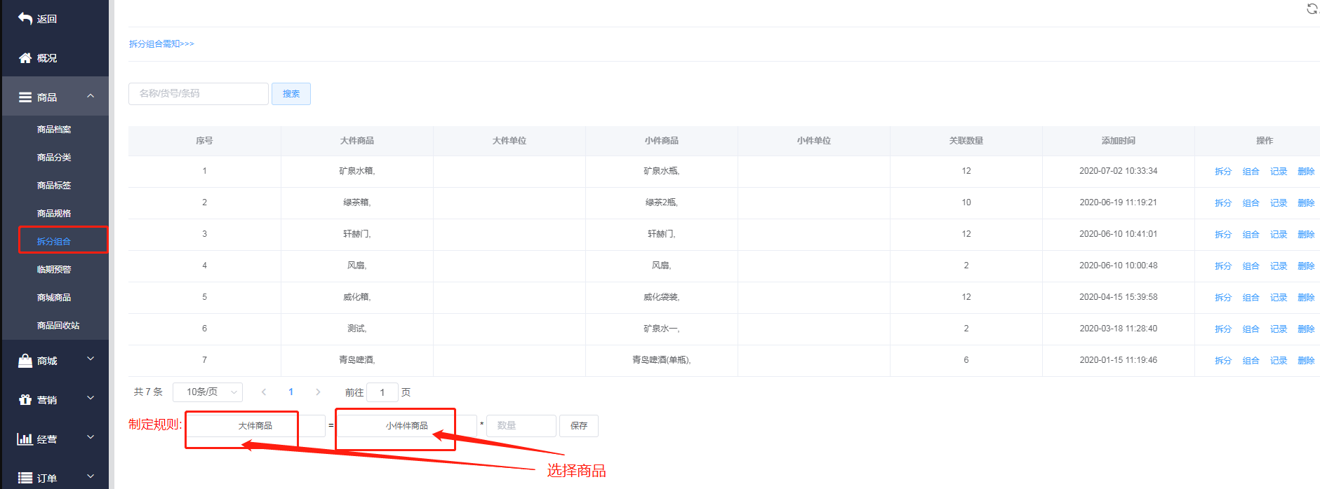 想要拆分商品必须要创建两个商品的档案,一个是大商品的档案’一个是小商品的档案
