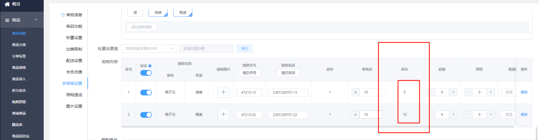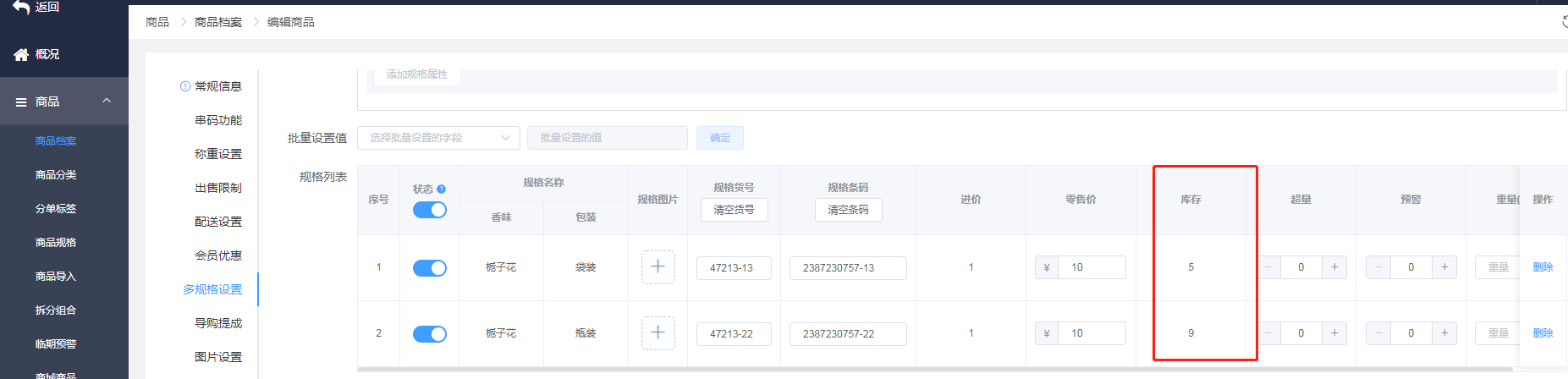 设置下多规格商品的库存