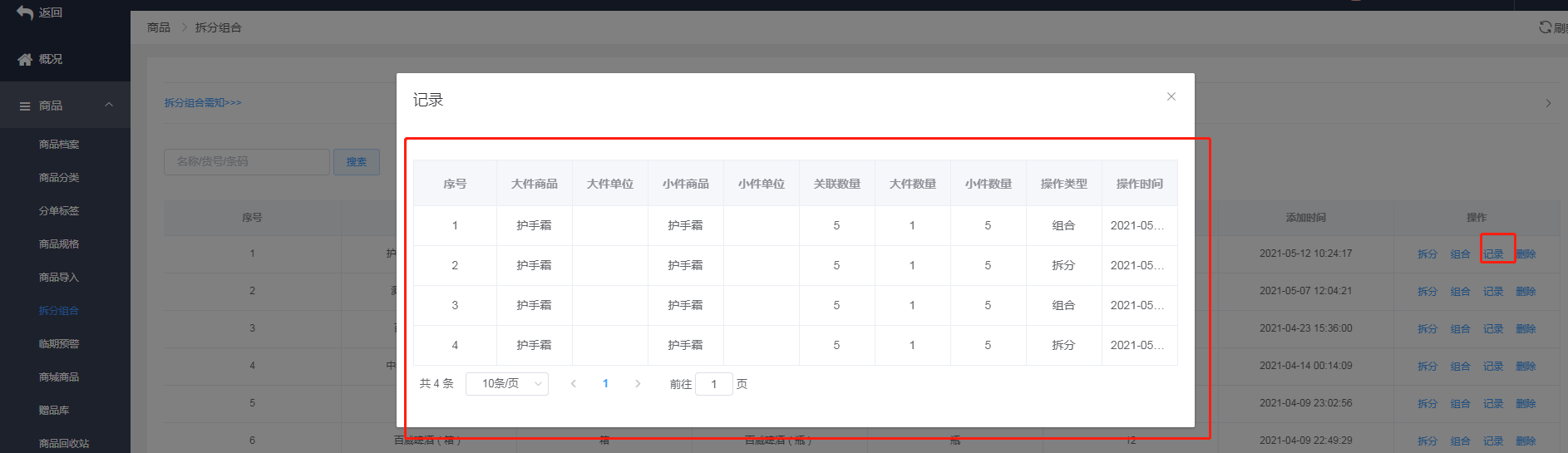 可以查看该商品的拆分记录