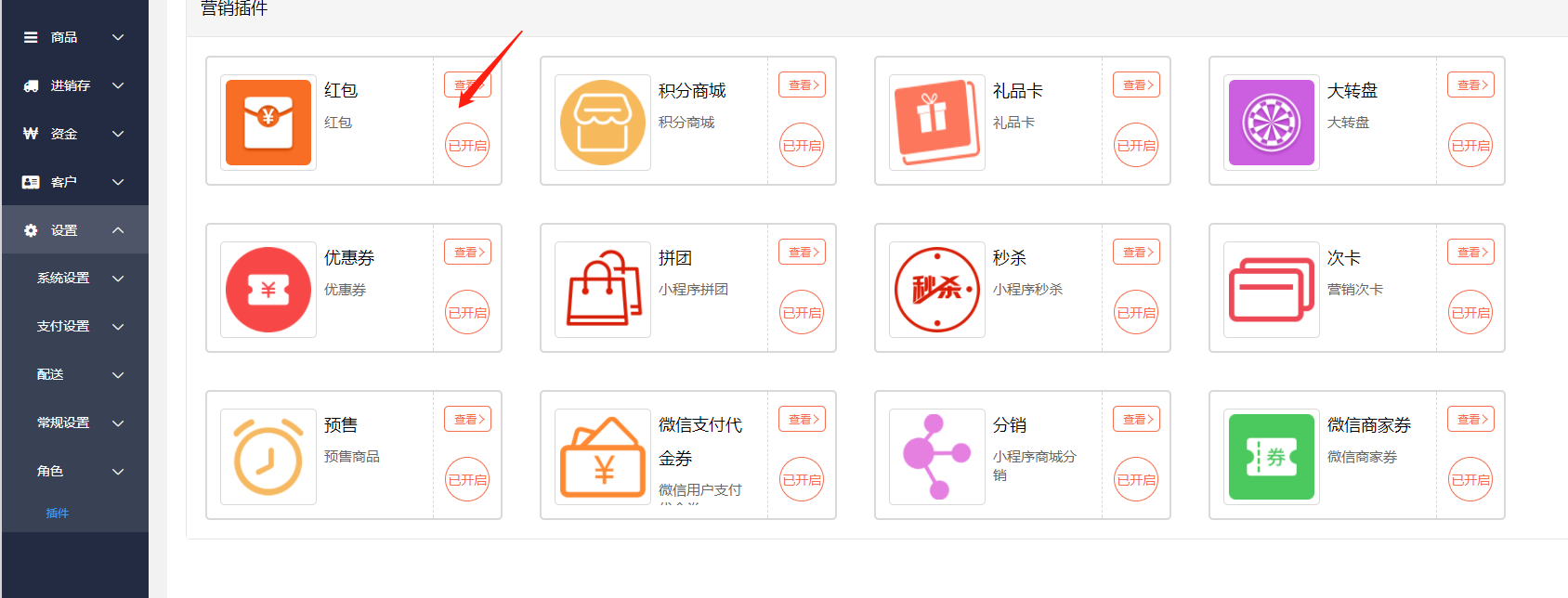 进入营销插件页面,有红包以及积分商城等插件,红包点击查看,进行新增红包,(注:红包分四种,第一种是公众号会员通知栏红包,第二种是线下支付红包,第三种是小程序商城红包,第四种是线上支付红包)