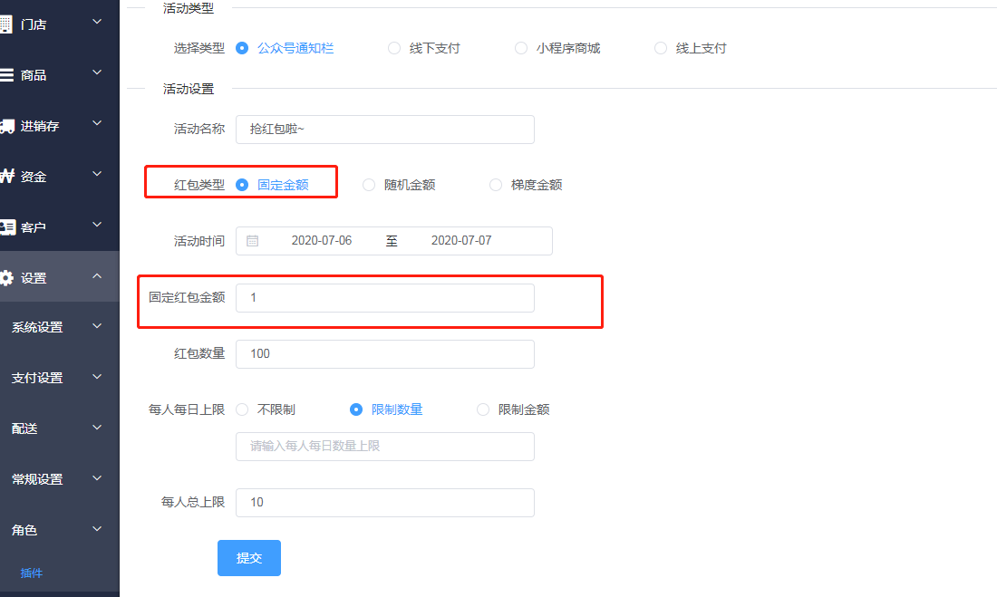 1.添加固定金额红包