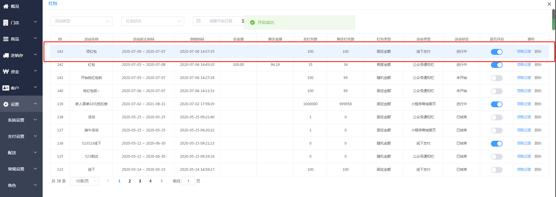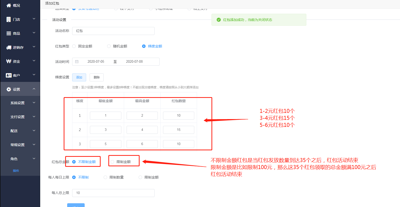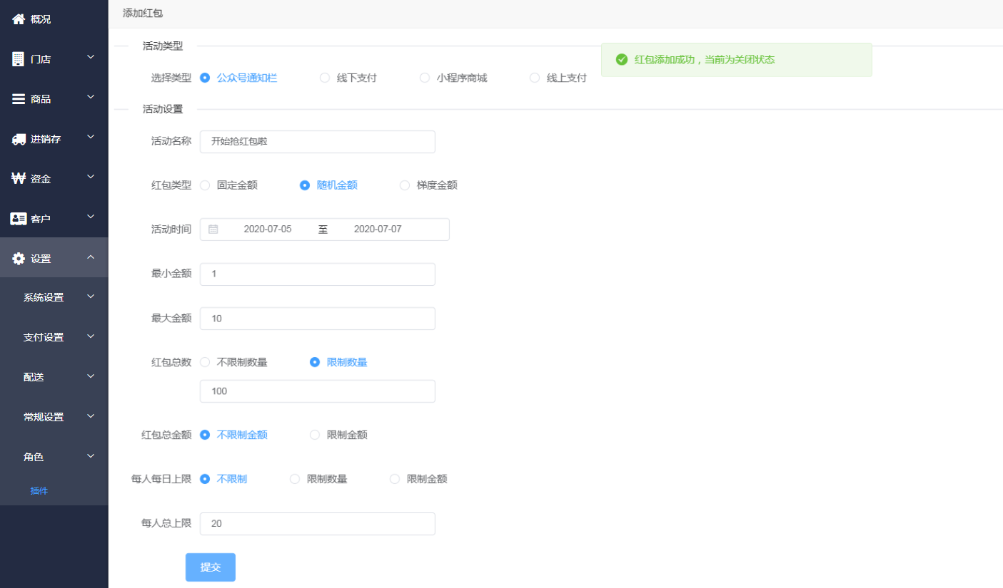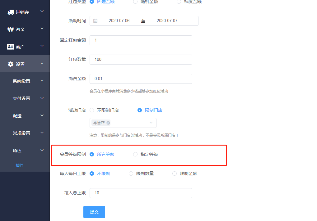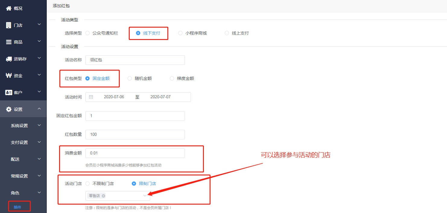 1.添加固定金额红包,可以选择消费多少送此红包,参加活动的门店,和限制会员参与等级