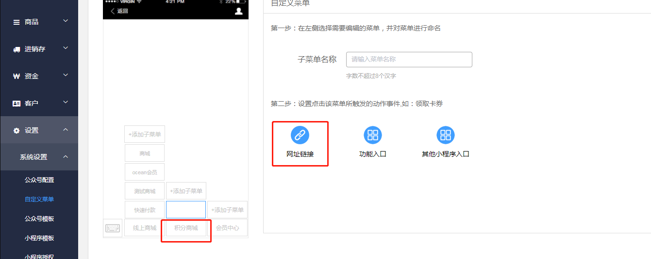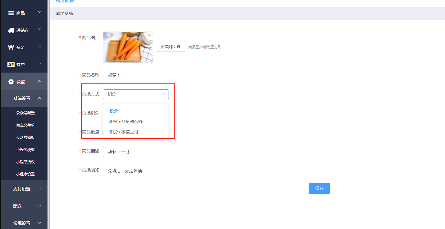 积分商城可放在公众号里,点击查看进入积分商城,点击添加商品,输入可兑换的商品信息,选择兑换