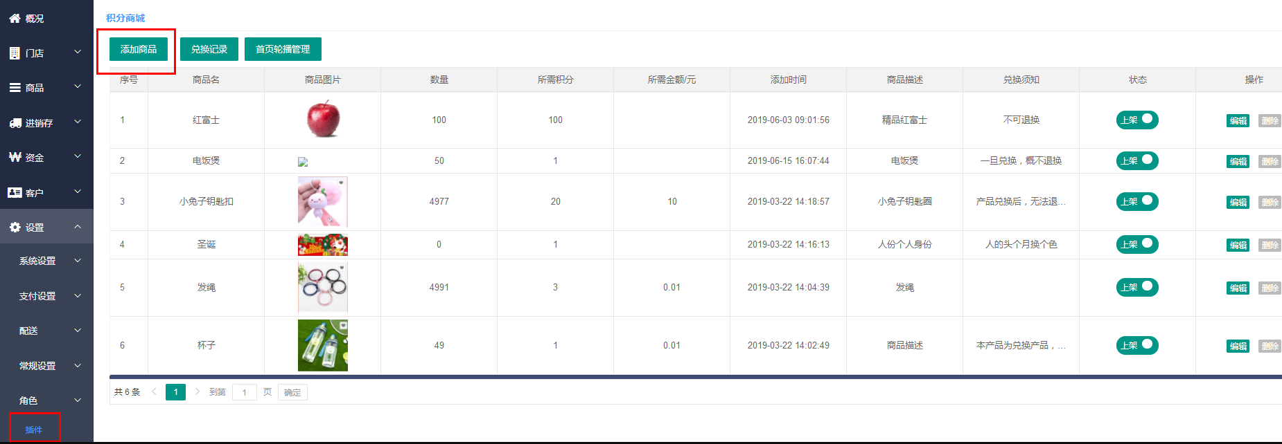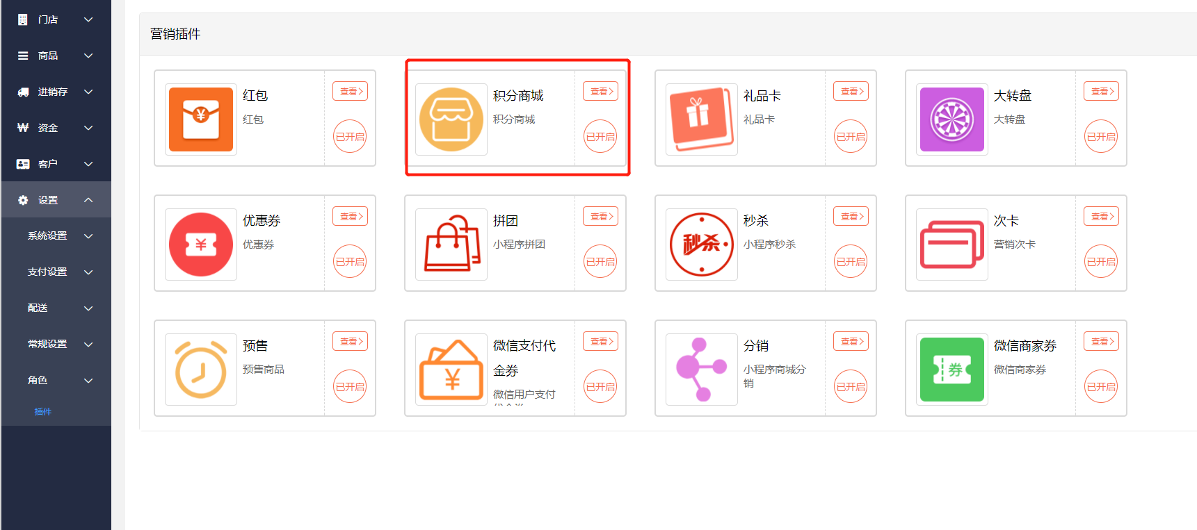 1、登录商户后台,点击设置,点击插件,点击积分商城,点击查看