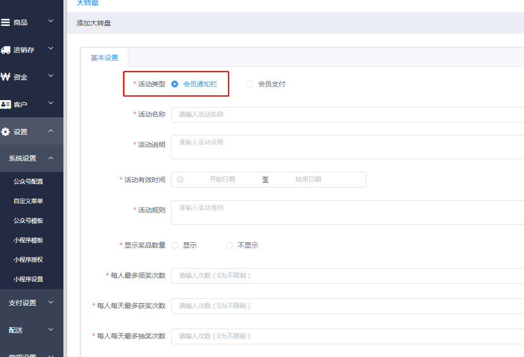 1.选择会员通知栏,填写大转盘相关信息