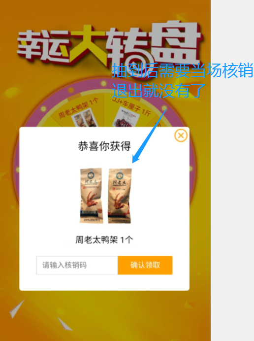 3.大转盘获得奖品后得当场核销,退出界面则奖品消失