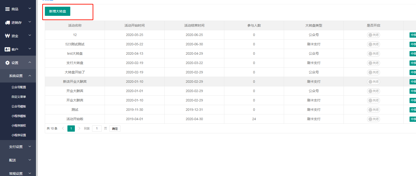 二、进入大转盘页面,点击查看——新增大转盘,根据页面提示填写大专盘内容(注:大转盘必须要填满8个,才可运营起来)