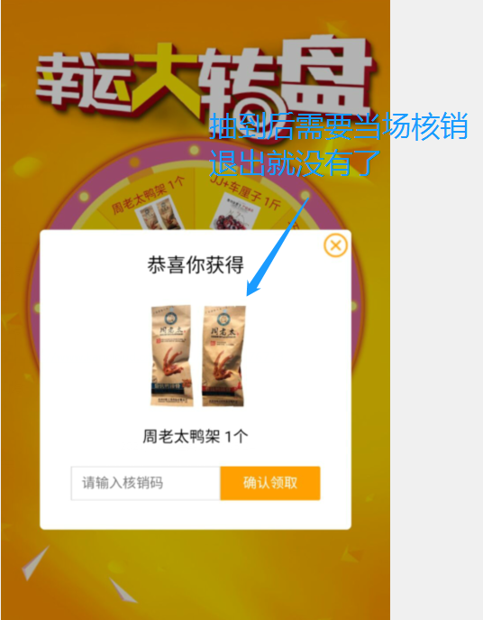 3.大转盘获得奖品后得当场核销,退出界面则奖品消失