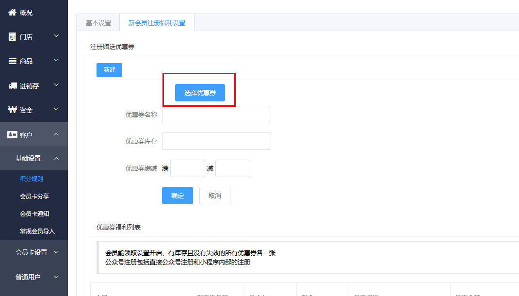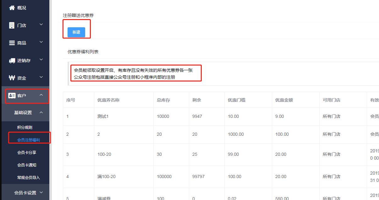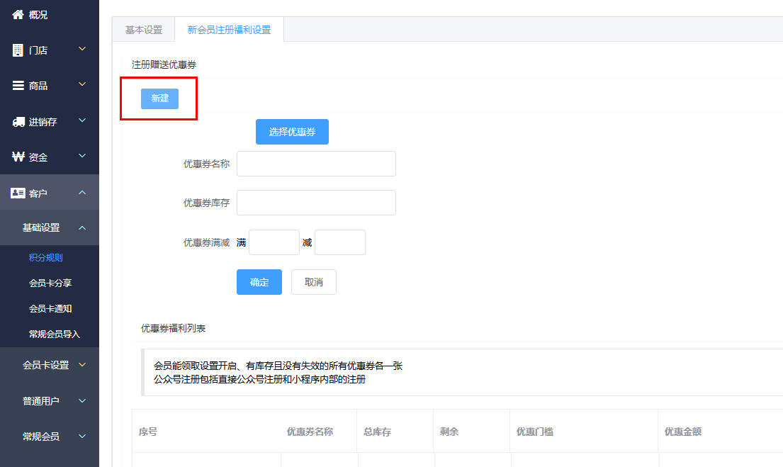 可以新增会员注册赠送优惠券,点击新建可以新建优惠券,输入优惠券名称、库存满减,设置完成后,只要新用户注册会员,就会收到推送的优惠券会员能领取。