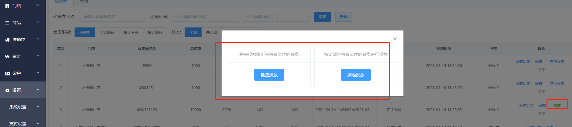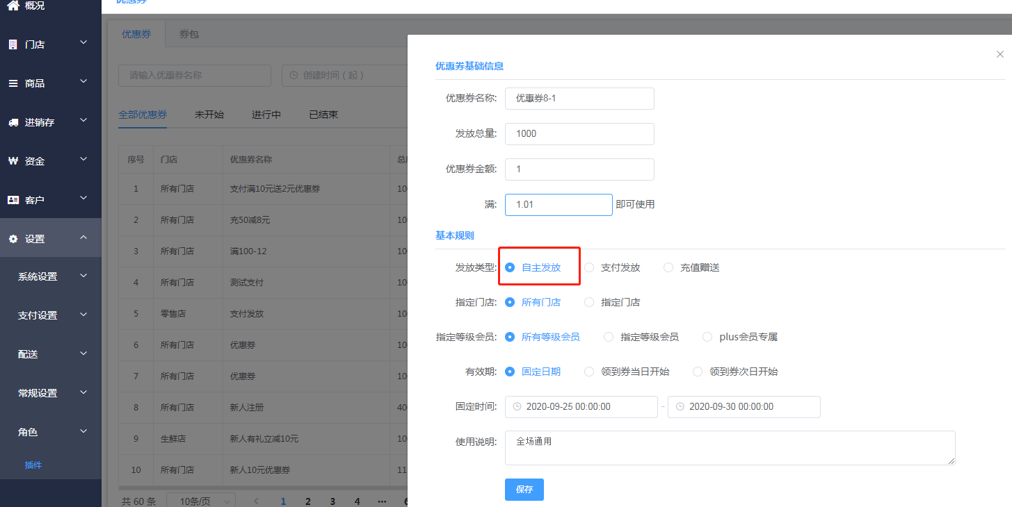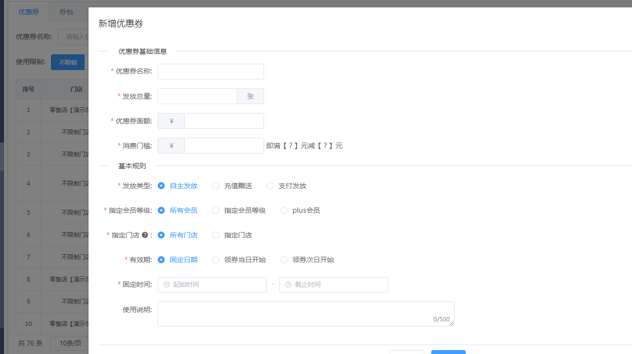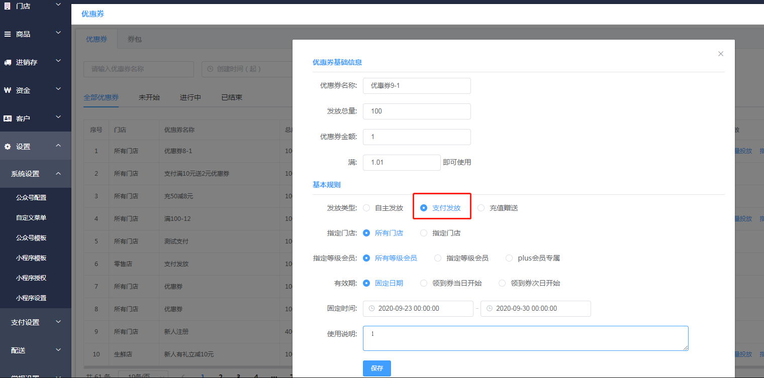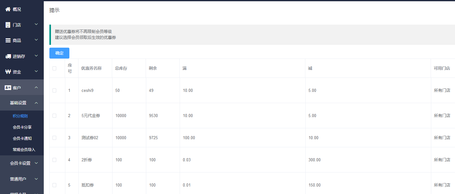 选择你要发放的会员等级、指定门店、有效期等进行设置优惠券,设置完成后点击提交