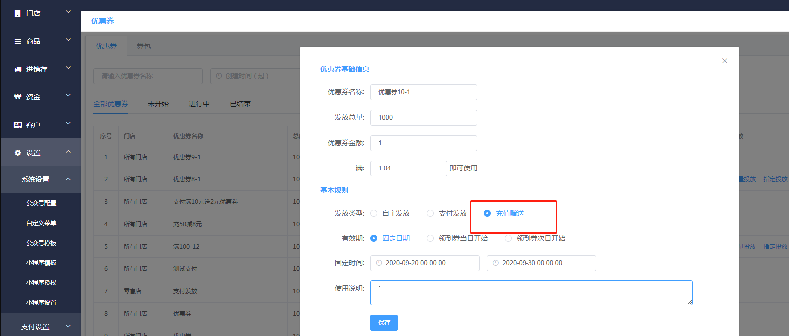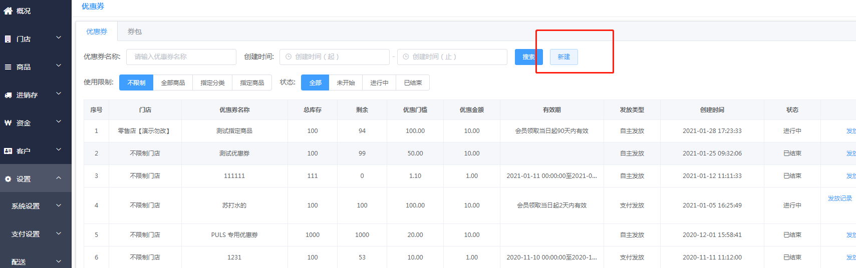 二、点击新建优惠券,输入优惠券的信息