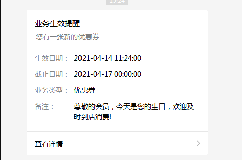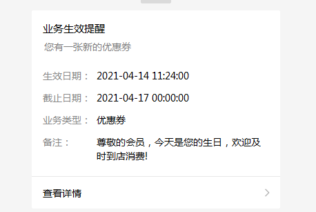 客户关注公众号,登录会员,就会收到一条优惠券模板消息通知