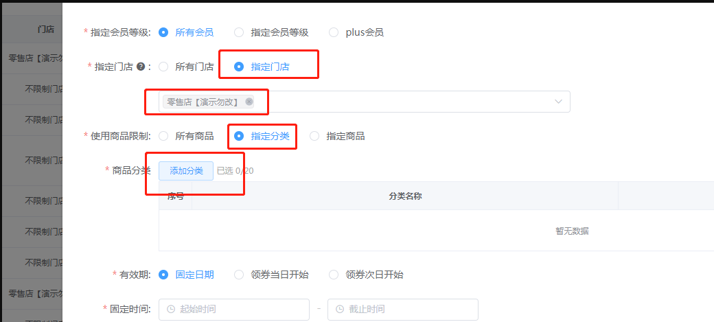 三、可以指定门店,指定分类或商品,必须要先选择门店,才可以指定商品