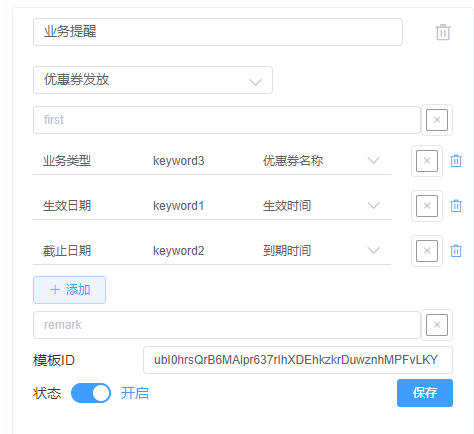 商户公众号模板消息配置完毕后,客户公众号就会接收到优惠券发放通知