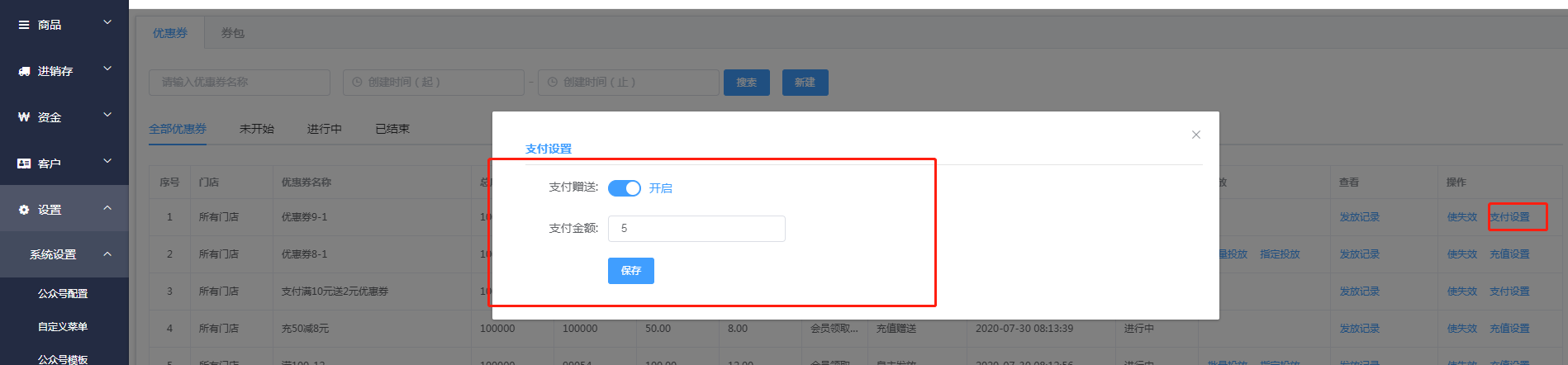 设置客户实际支付多少金额后赠送