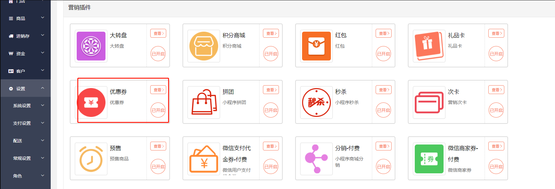 一、点击设置,点击插件,点击优惠券中的查看