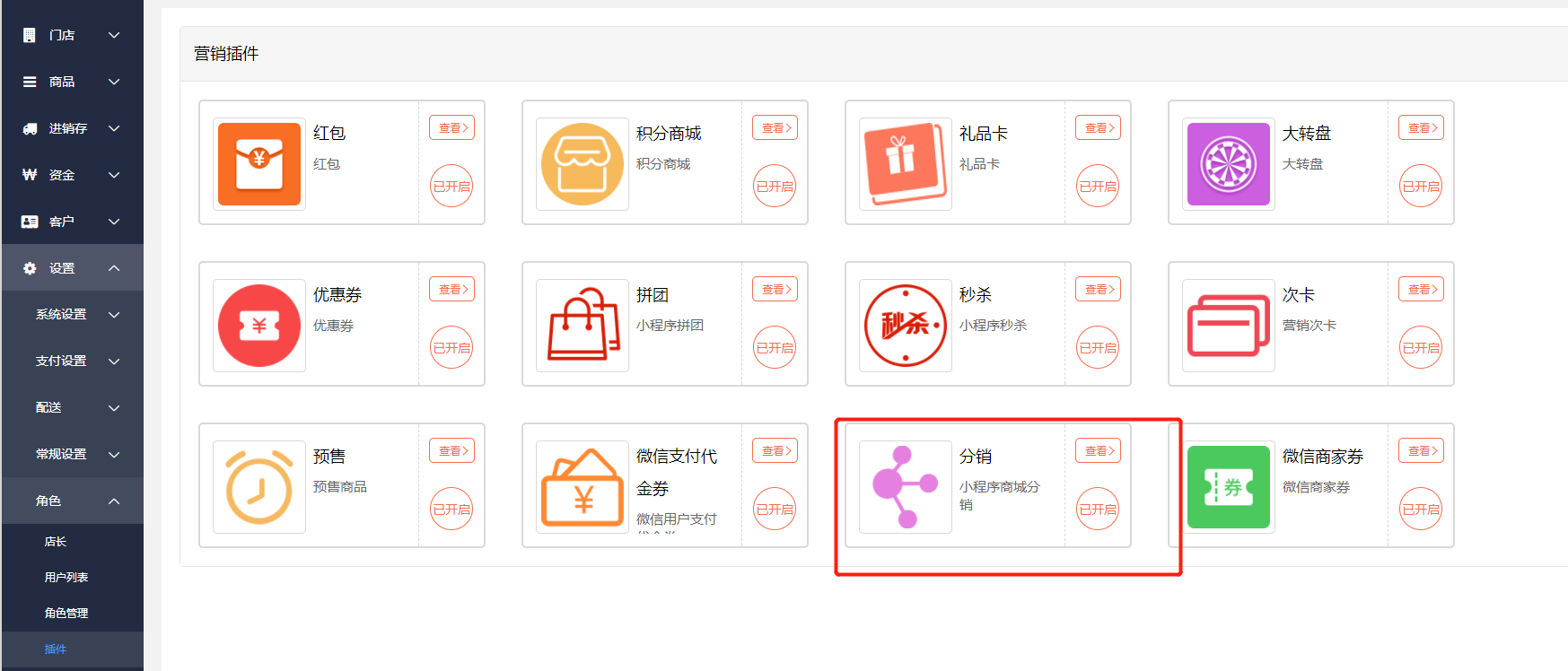 2.当商户拥有分销插件的使用权限后,商户下的门店就都会拥有分销的使用权限