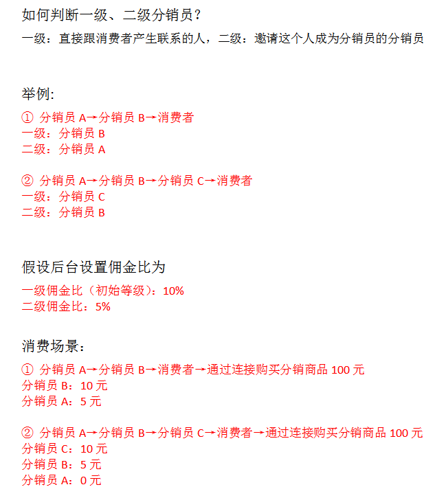 分销员B自己购买商品,分销员B自己能获得到一级分销佣金,分销员A可以获得二级分销员佣金