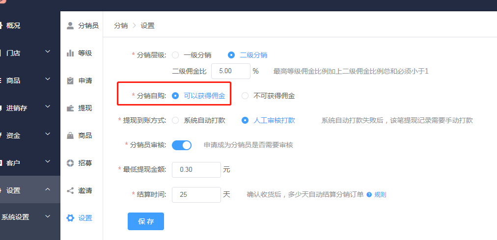 二级分销佣金比例=分销设置里设置的固定二级佣金比例(修改比例不影响之前的未结算订单)