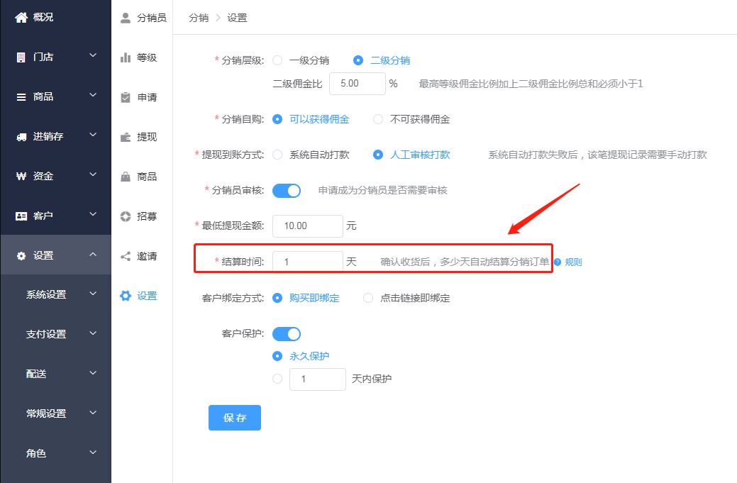 **假设设置了一天的话,如果客户是昨天下午在店内购买的分销商品,那么到今天下午才算是一天,才会显示已结算。但是分销员还不能申请提现,因为定时任务设置的是每天凌晨执行一次的,那么这分销员明天凌晨才可以显示可提现金额**