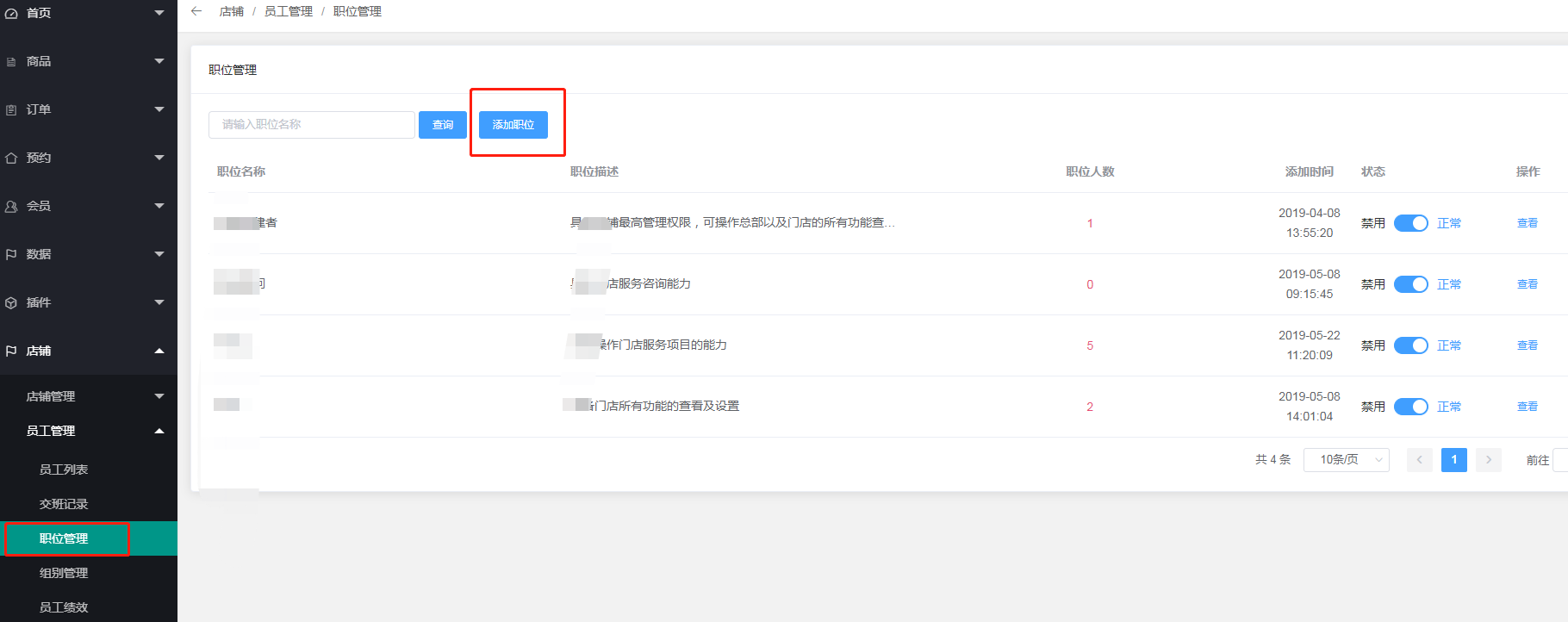 添加员工之前先进行添加职位,对员工的职位进行划分,系统会自动生成四个职位,如果商家觉得这四个职位已经可以满足使用则不需要进行创建