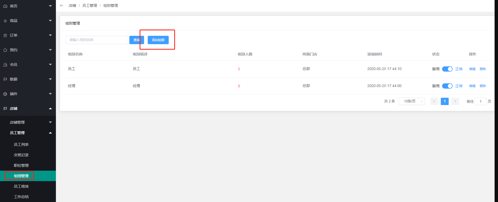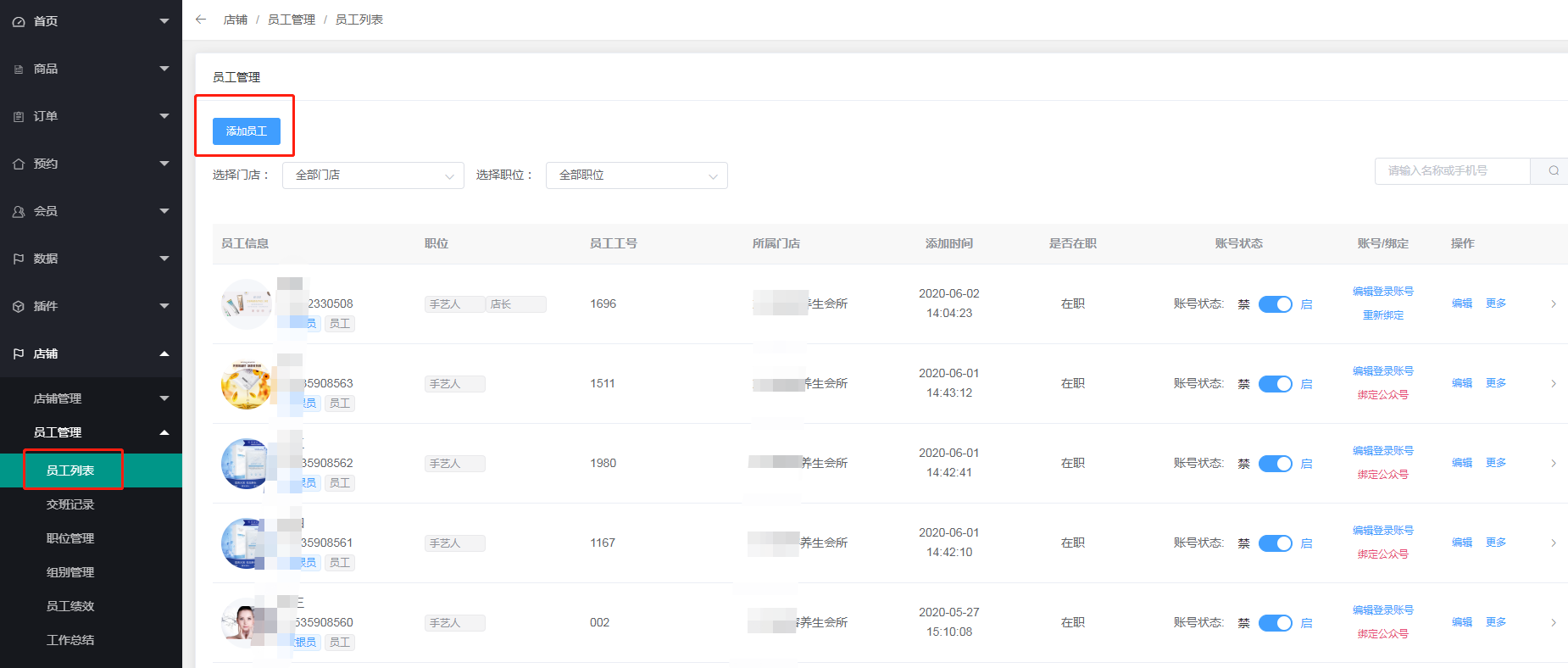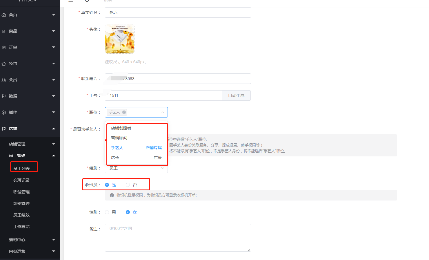 3、添加员工(分为手艺人、收银员、店铺创建者等)