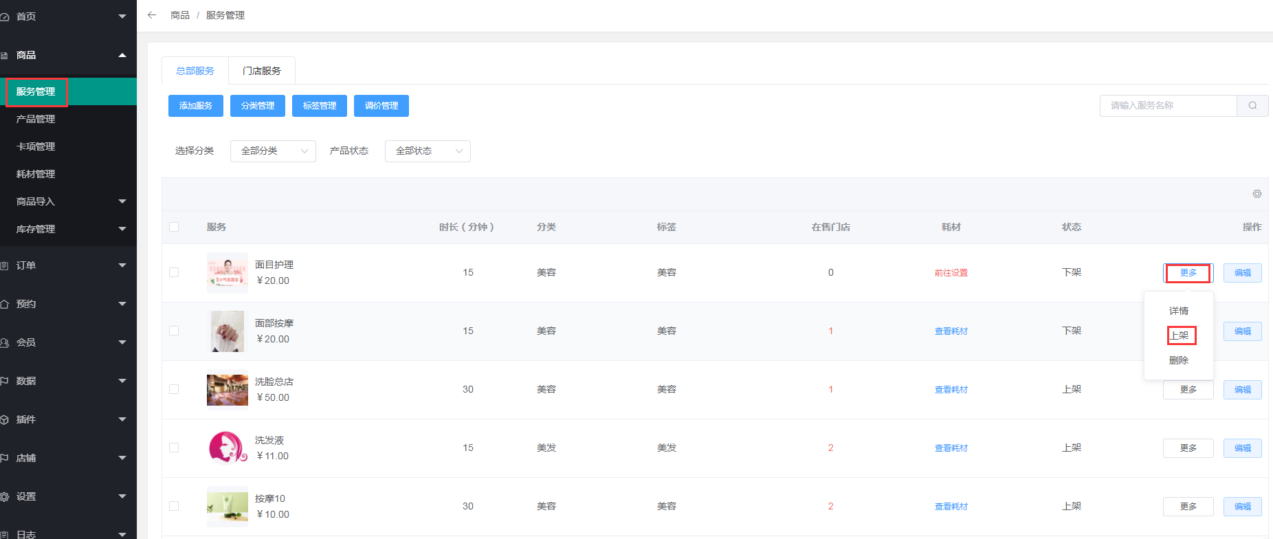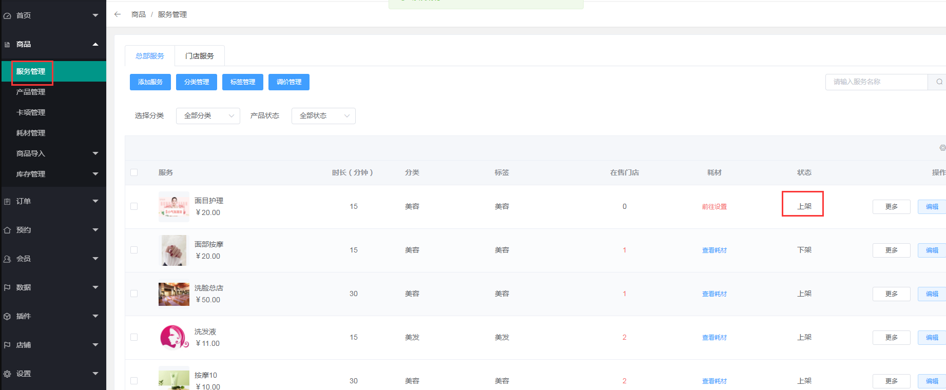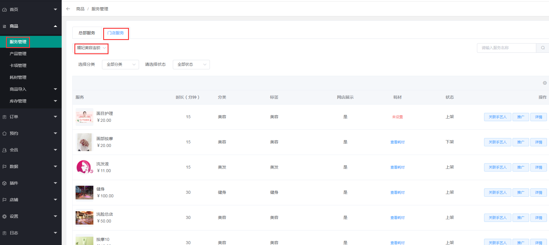切换到总部,点击商品---服务管理---门店服务,可以查看各个门店内的服务,关联的技师,服务所需要的耗材及这项服务的详情