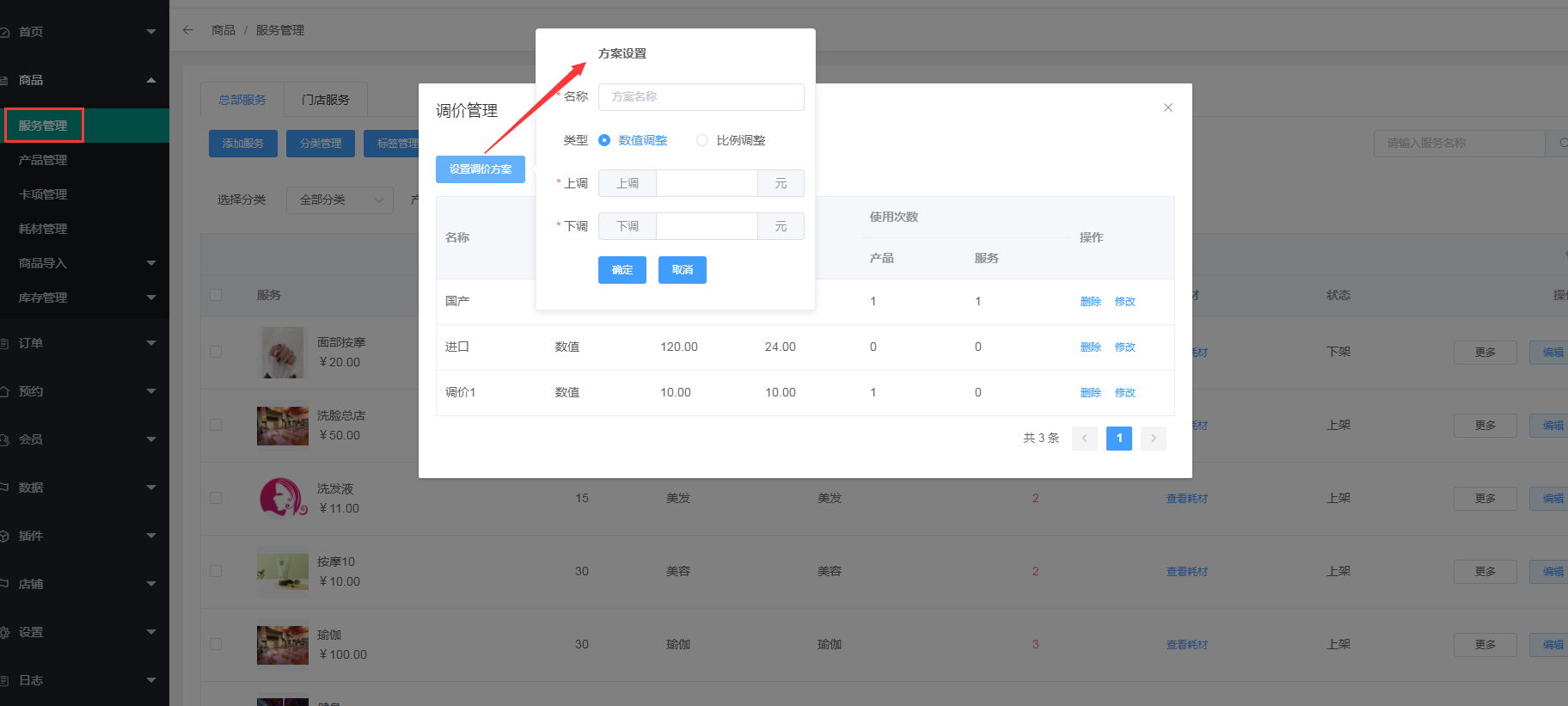 4、点击商品---服务管理---调价管理