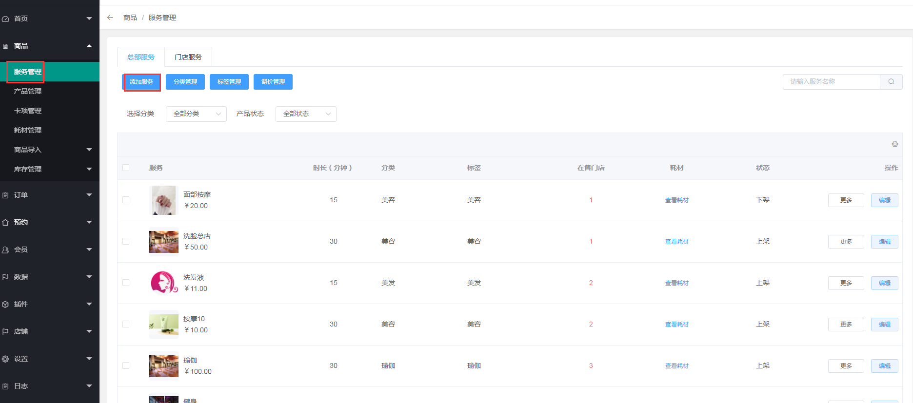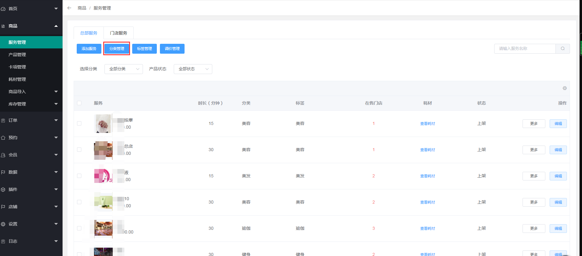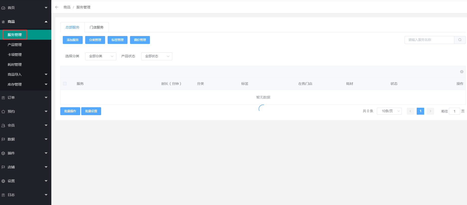 1、点击商品---服务管理(添加服务之前先添加分类管理,标签管理,调价管理)