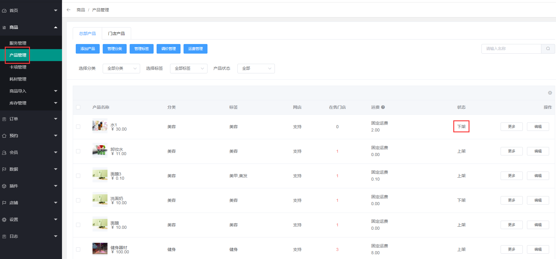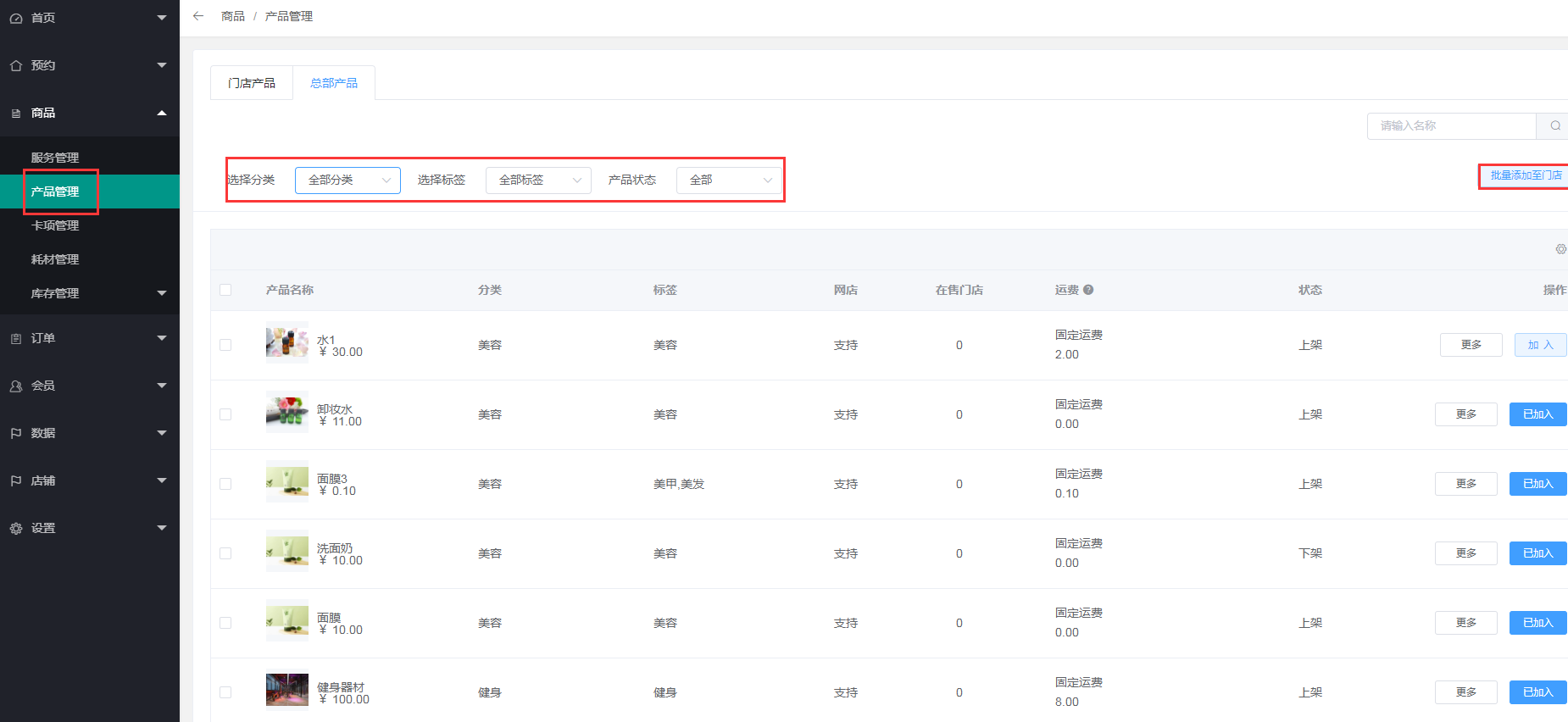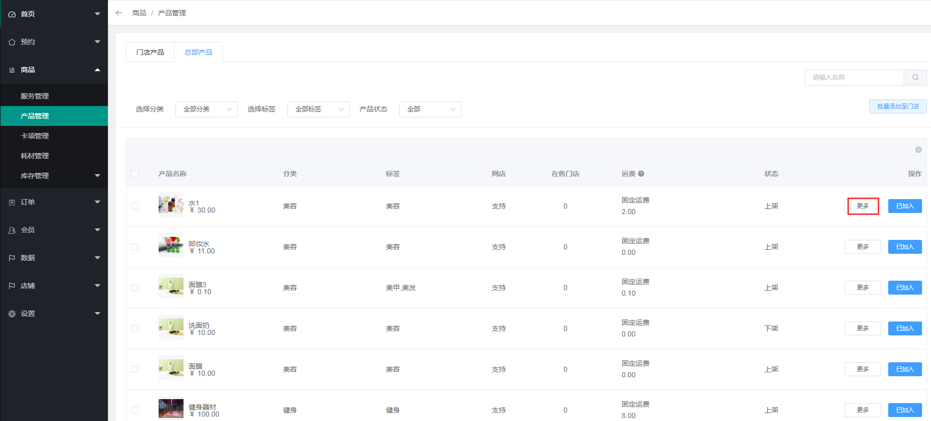 切换到总部,点击商品---产品管理---门店管理 ,(可查看各个门店的产品,也可以根据分类 标签 状态查看门店的产品)