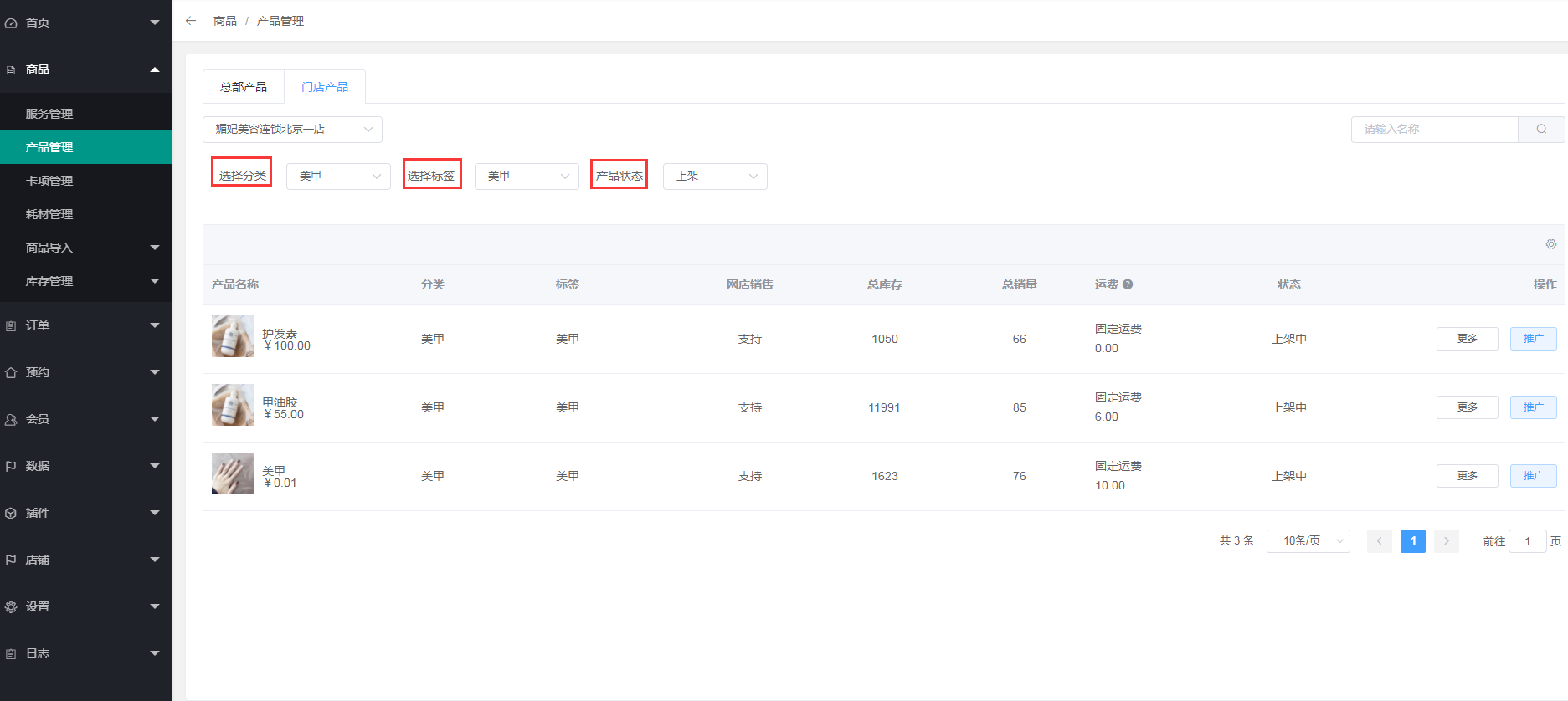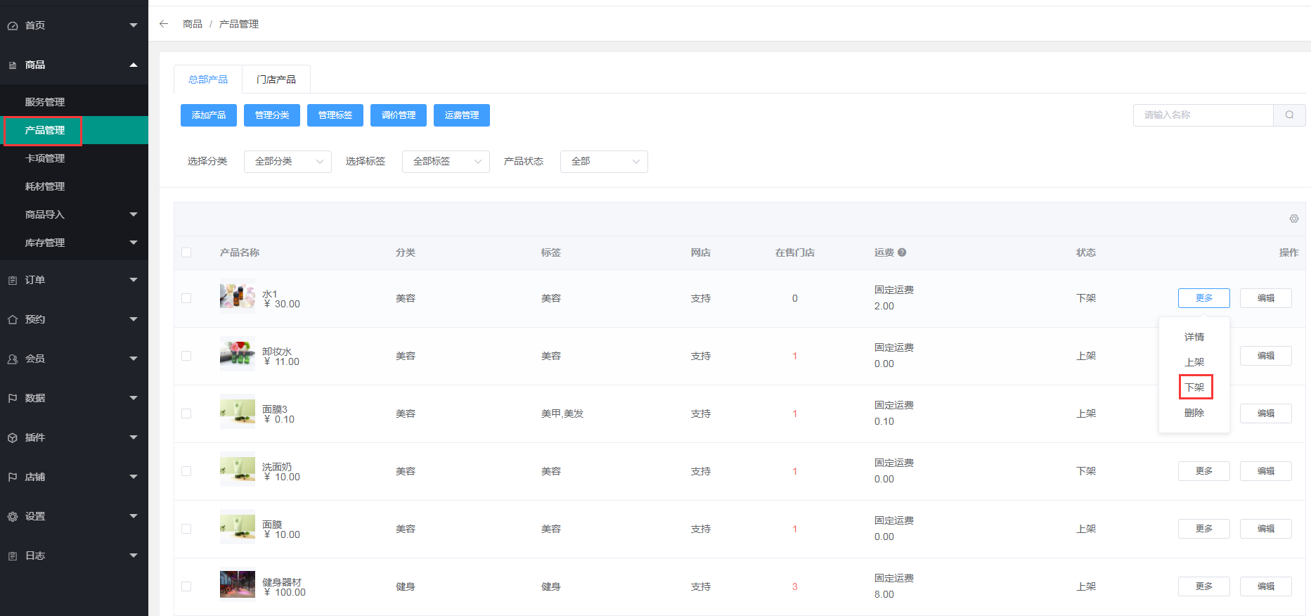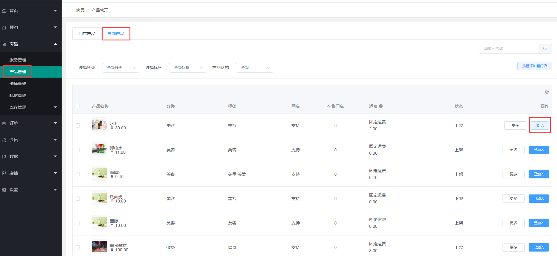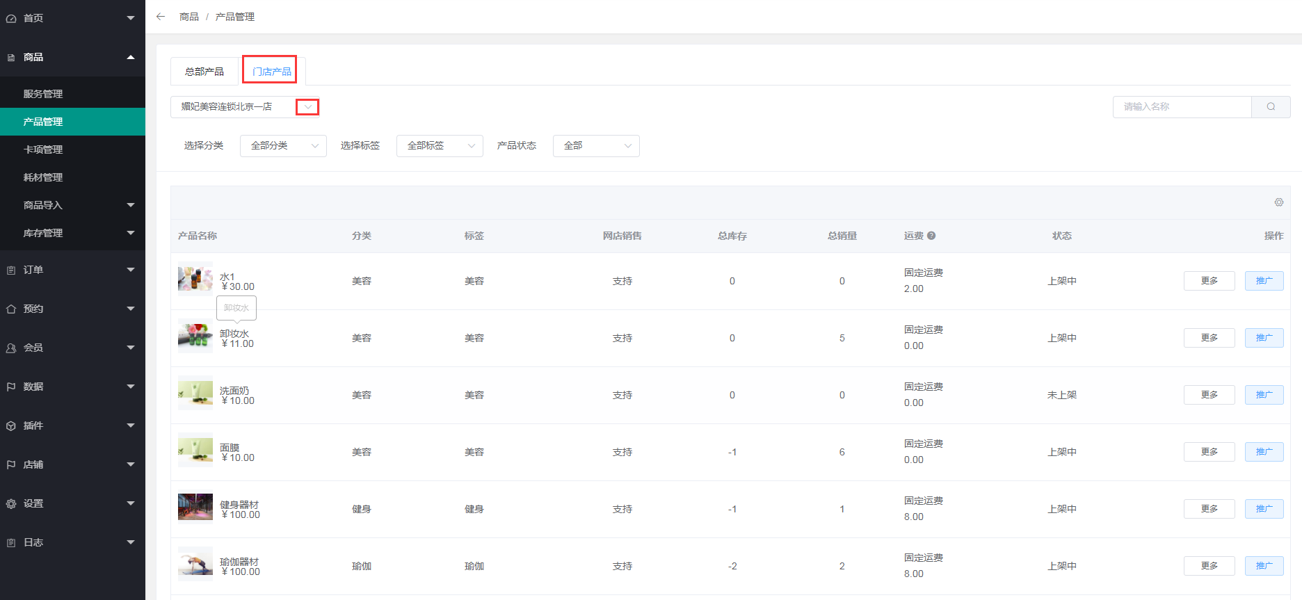 切换到总部,点击商品---产品管理---门店管理 ,(可查看各个门店的产品,也可以根据分类 标签 状态查看门店的产品)