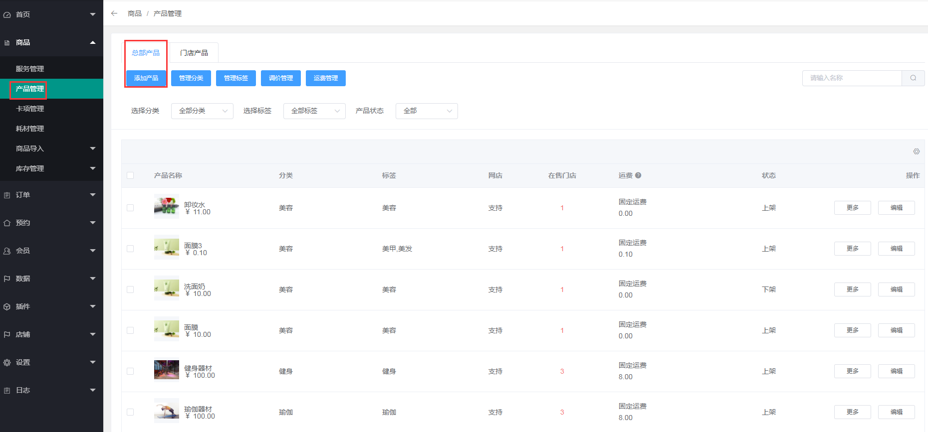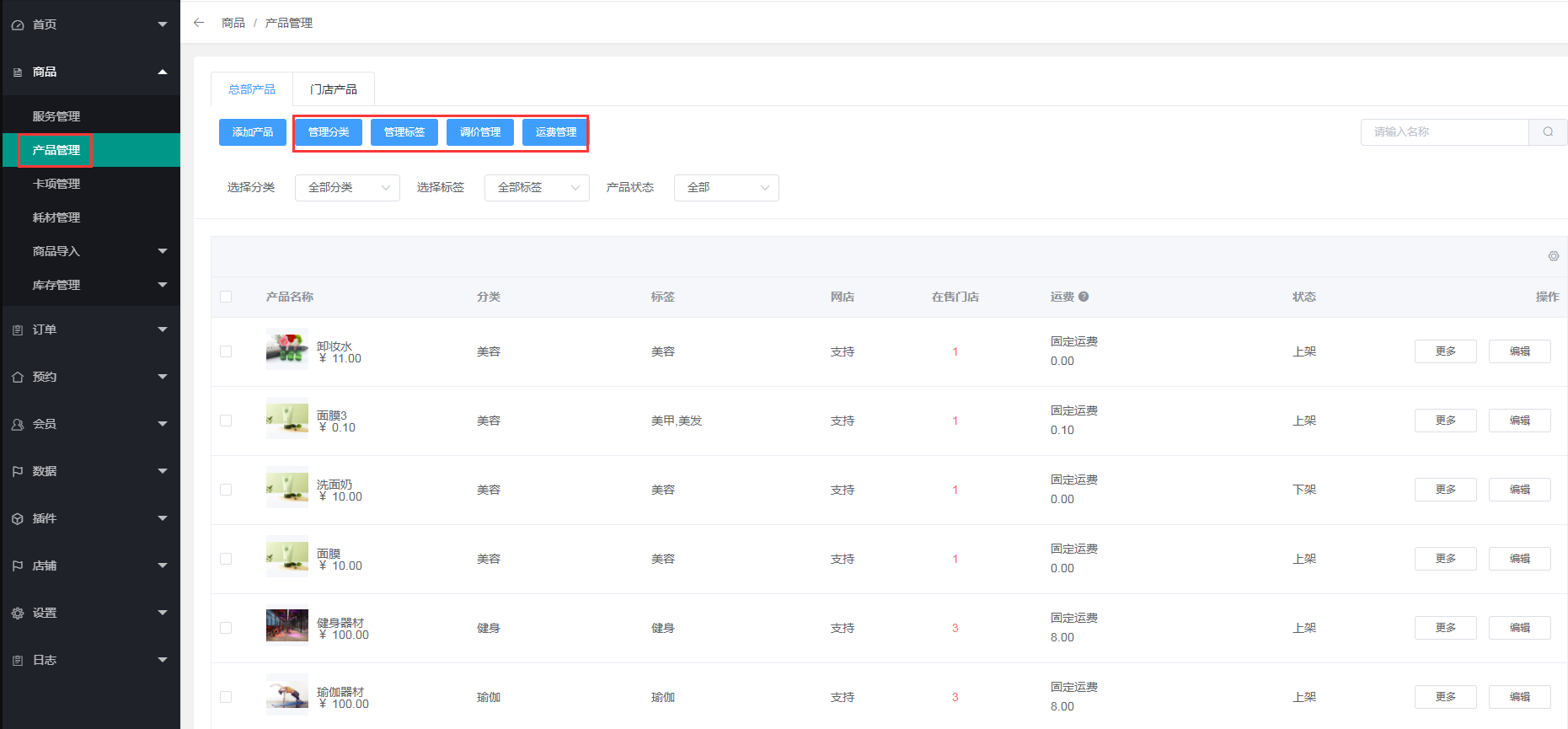 2、添加产品之前需要先添加,管理分类,管理标签,调价管理,运费管理