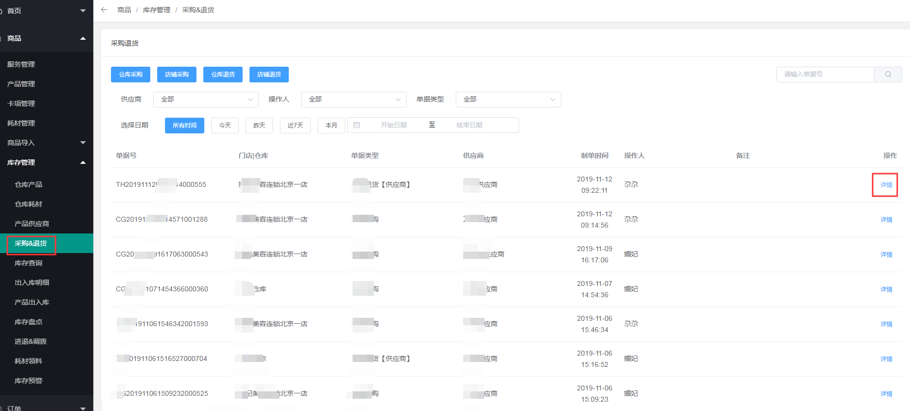 4、门店可在商品---出入库明细中查看,也可根据出入库类型,单据类型,时间查询订单