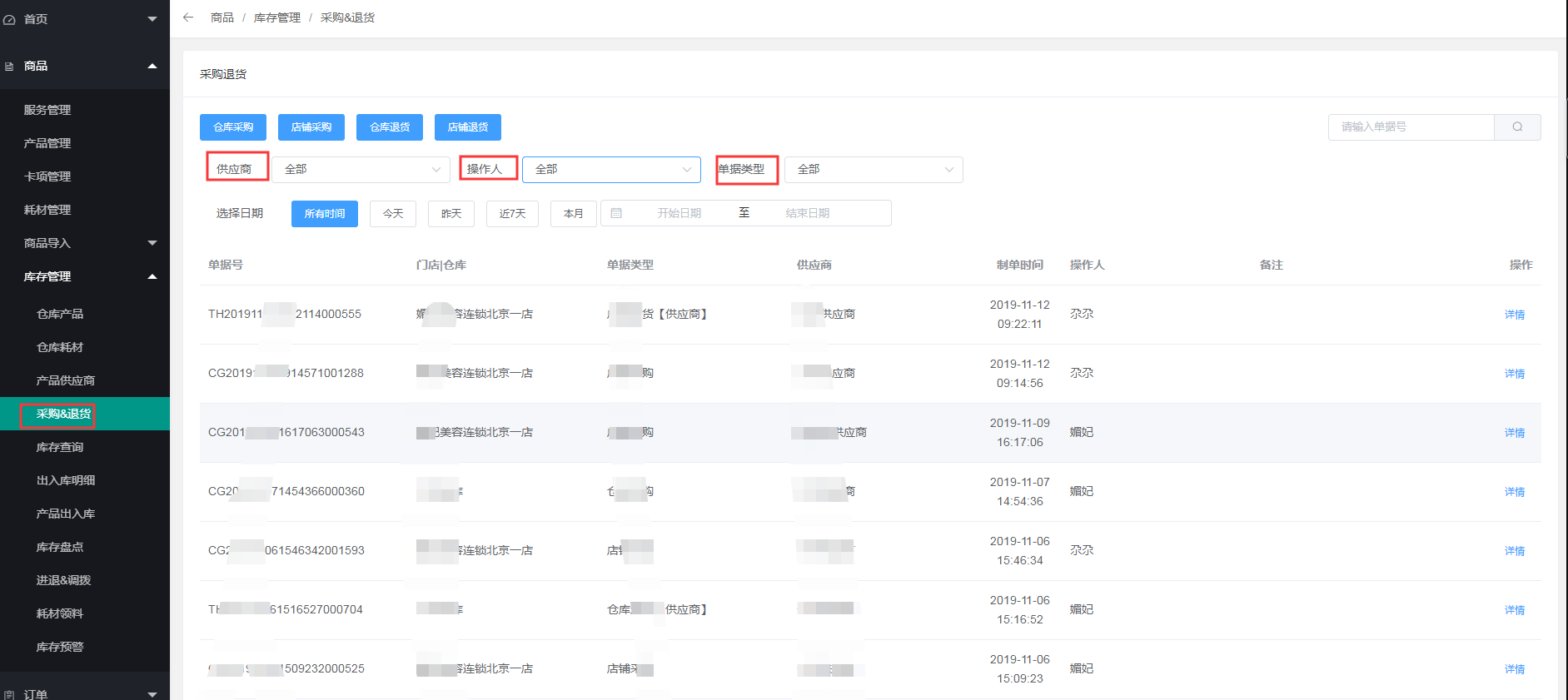 3、总部可在商品---库存管理---采购$退货中根据供应商、操作人、单据类型产看采购订单