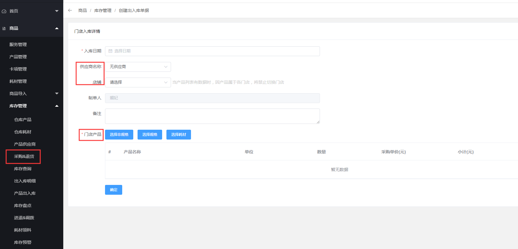 2、店铺采购(选择对应的供应商,采购的门店和产品)